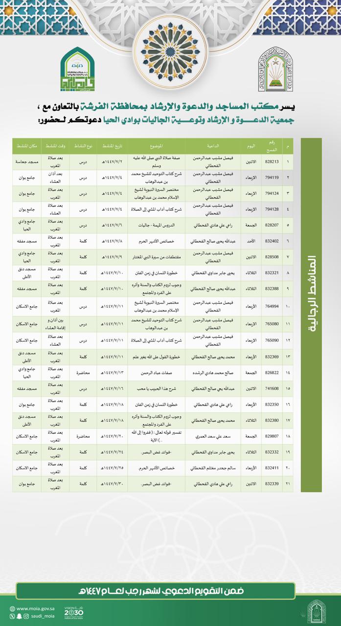 الشؤون الإسلامية بعسير تنفذ مناشط دعوية بمحافظة الفرشة خلال شهر رجب تنفّذ وزارةُ الشؤون الإسلامية والدعوة والإرشاد، ممثَّلةً بفرعها بمنطقة عسير ـ مكتب المساجد بمحافظة الفرشة -، وبالتعاون مع جمعية الدعوة والإرشاد بمركز وادي الحيا، خلال الفترة من اليوم الاثنين الثاني 02/رجب/1447 التفاصيل