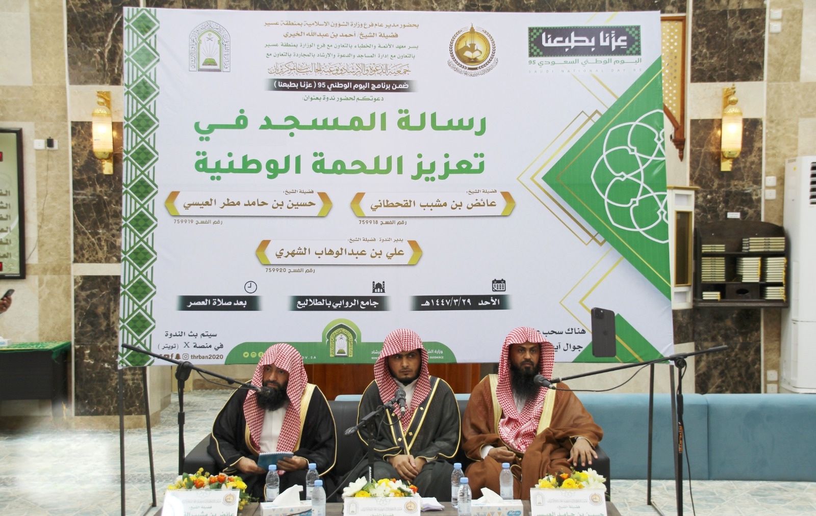 الشؤون الإسلامية بعسير تنظم ندوة بعنوان "رسالة المسجد في تعزيز اللحمة الوطنية" بمحافظة المجاردةنظمت وزارة الشؤون الإسلامية والدعوة والإرشاد ممثلةً بمعهد الأئمة والخطباء، يوم الأحد التاسع والعشرين من شهر ربيع الأول 1447هـ، ندوة توعوية بعنوان: (رسالة المسجد في تعزيز اللحمة الوطنية)، وذلك تزامنًا 30/ربيع الأول/1447 التفاصيل