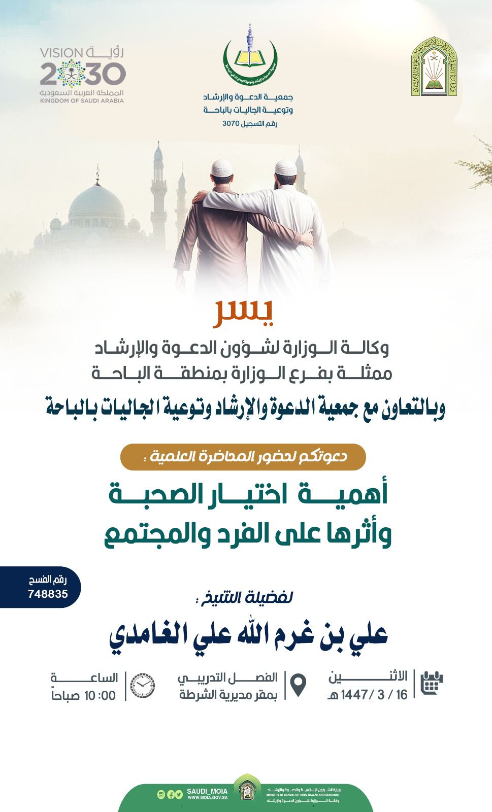 الشؤون الإسلامية بالباحة تنظم محاضرات وكلمات ودروس بمدينة الباحة والعقيق ينظم فرع وزارة الشؤون الإسلامية والدعوة والإرشاد بمنطقة الباحة بالتعاون مع جمعية الدعوة والإرشاد وتوعية الجاليات بالباحة ، اليوم الثلاثاء السابع عشر من ربيع الاول للعام الحالي ١٤٤٧هـ محاضرة علميه بعنوان 17/ربيع الأول/1447 التفاصيل