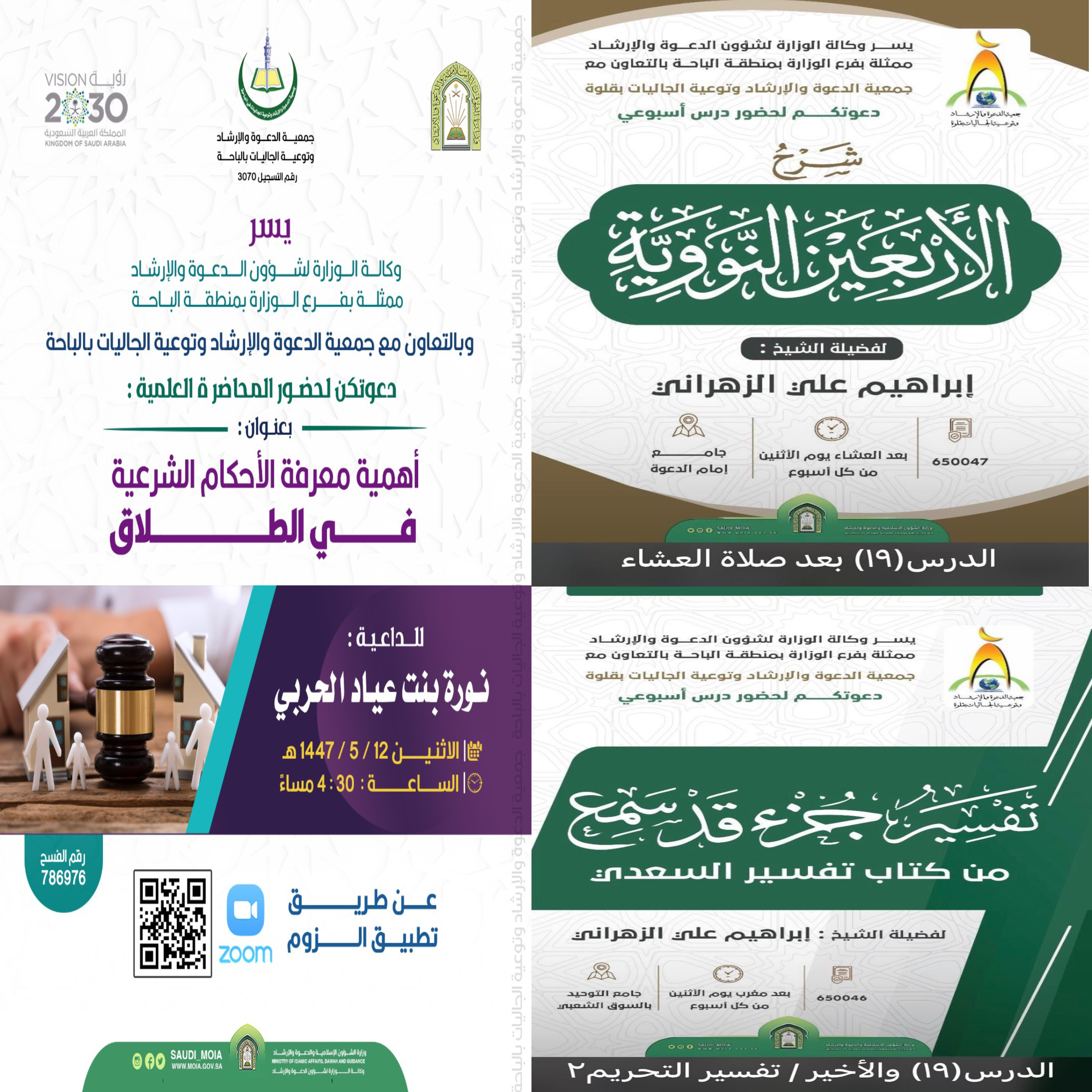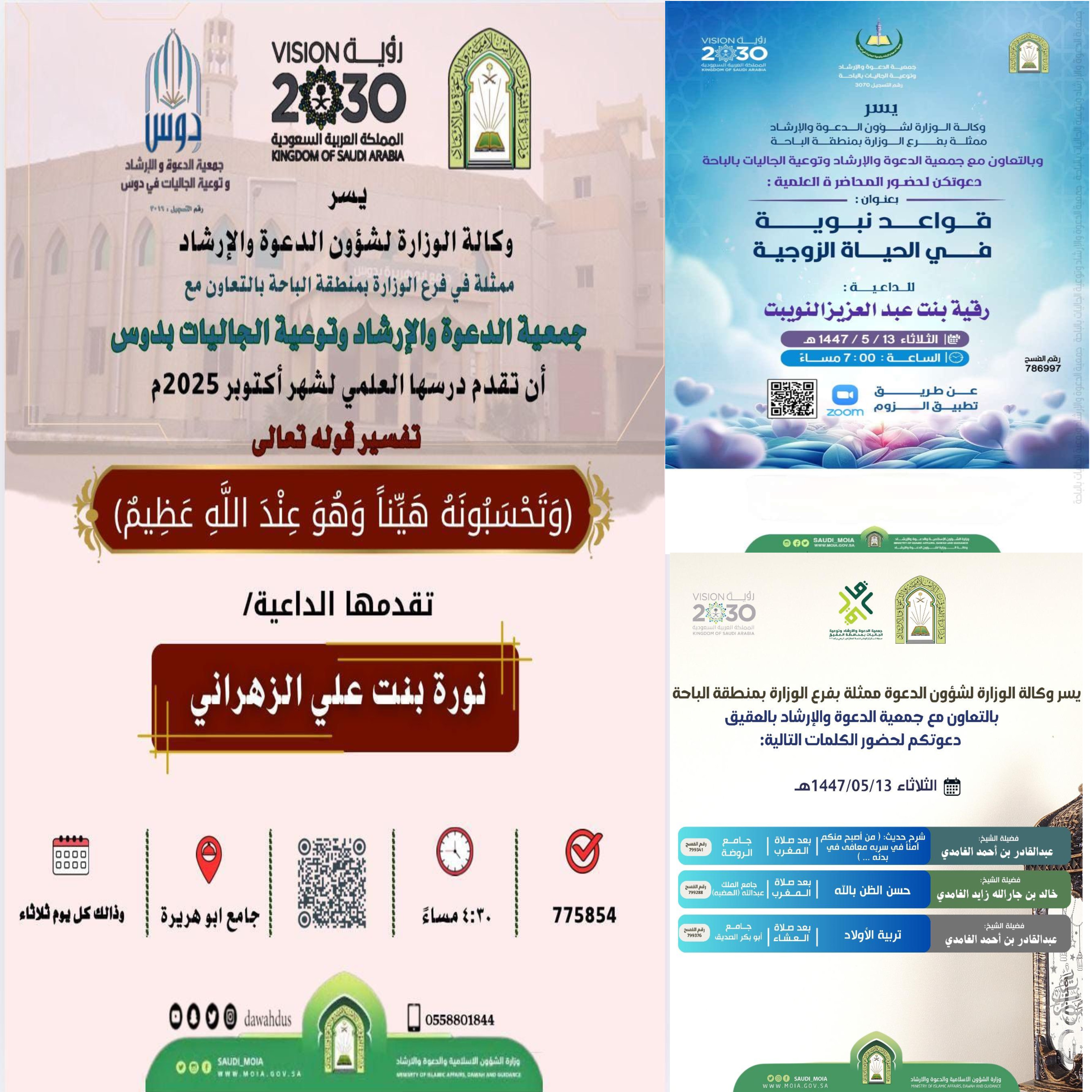 الشؤون الإسلامية بالباحة تنظم ثلاث محاضرات دعوية نسائية في عددٍ من محافظات المنطقةتنظّم وزارة الشؤون الإسلامية والدعوة والإرشاد في منطقة الباحة، وبالتعاون مع جمعيات الدعوة والإرشاد وتوعية الجاليات في المنطقة ومحافظاتها – القسم النسائي – اليوم الثلاثاء الثالث عشر من شهر جمادى الأولى 13/جمادى الأولى/1447 التفاصيل