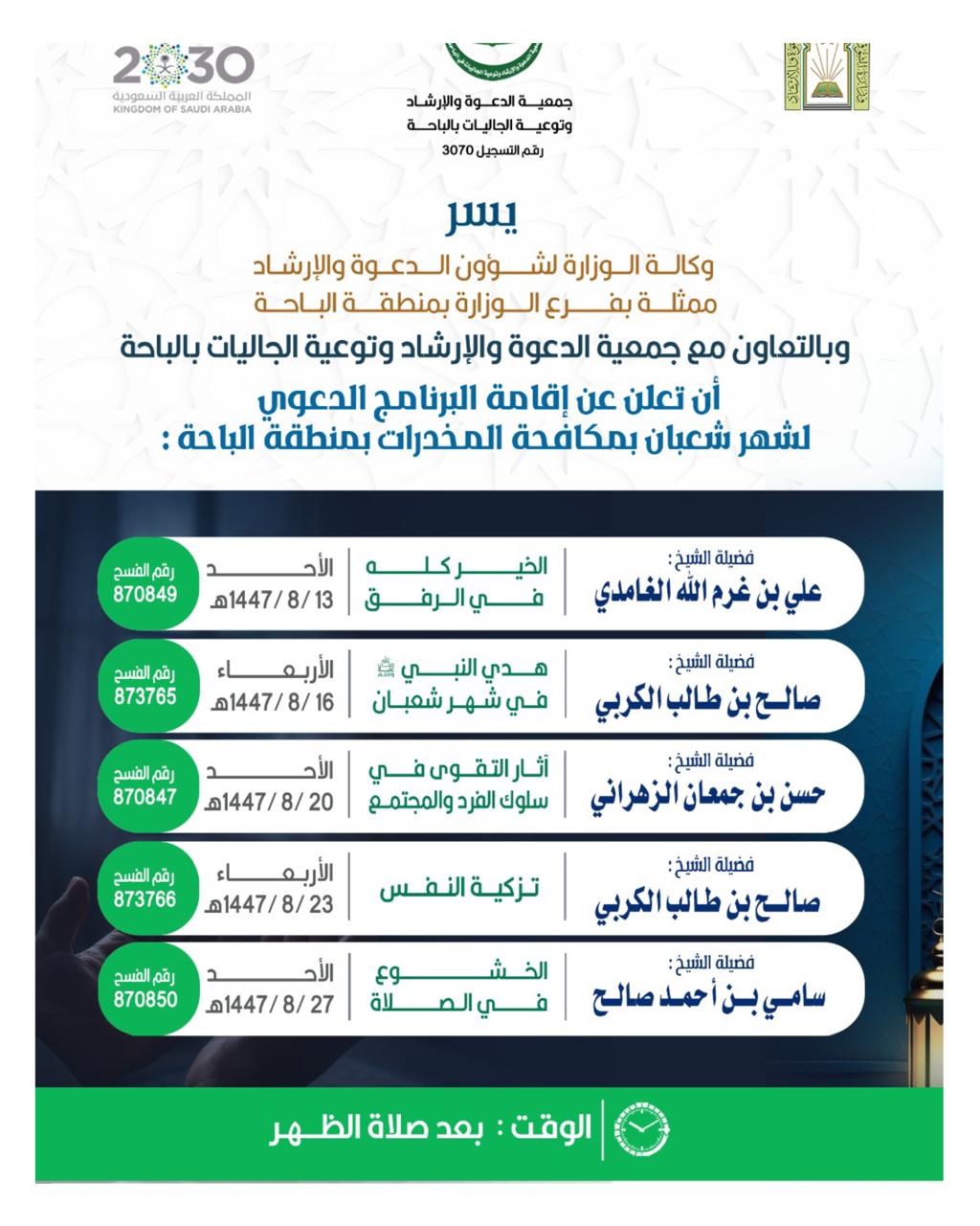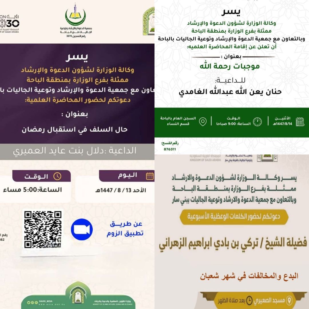 الشؤون الإسلامية بالباحة تطلق برنامجًا دعويًا نسائيًا خلال شهر شعبان عبر منصة الزوومأطلقت وزارة الشؤون الإسلامية والدعوة والإرشاد، ممثّلةً بفرعها في منطقة الباحة، وبالتعاون مع جمعية الدعوة والإرشاد وتوعية الجاليات بمدينة الباحة ، برنامجًا دعويًا نسائيًا ، ابتداءً من يوم الأربعاء التاسع 14/شعبان/1447 التفاصيل