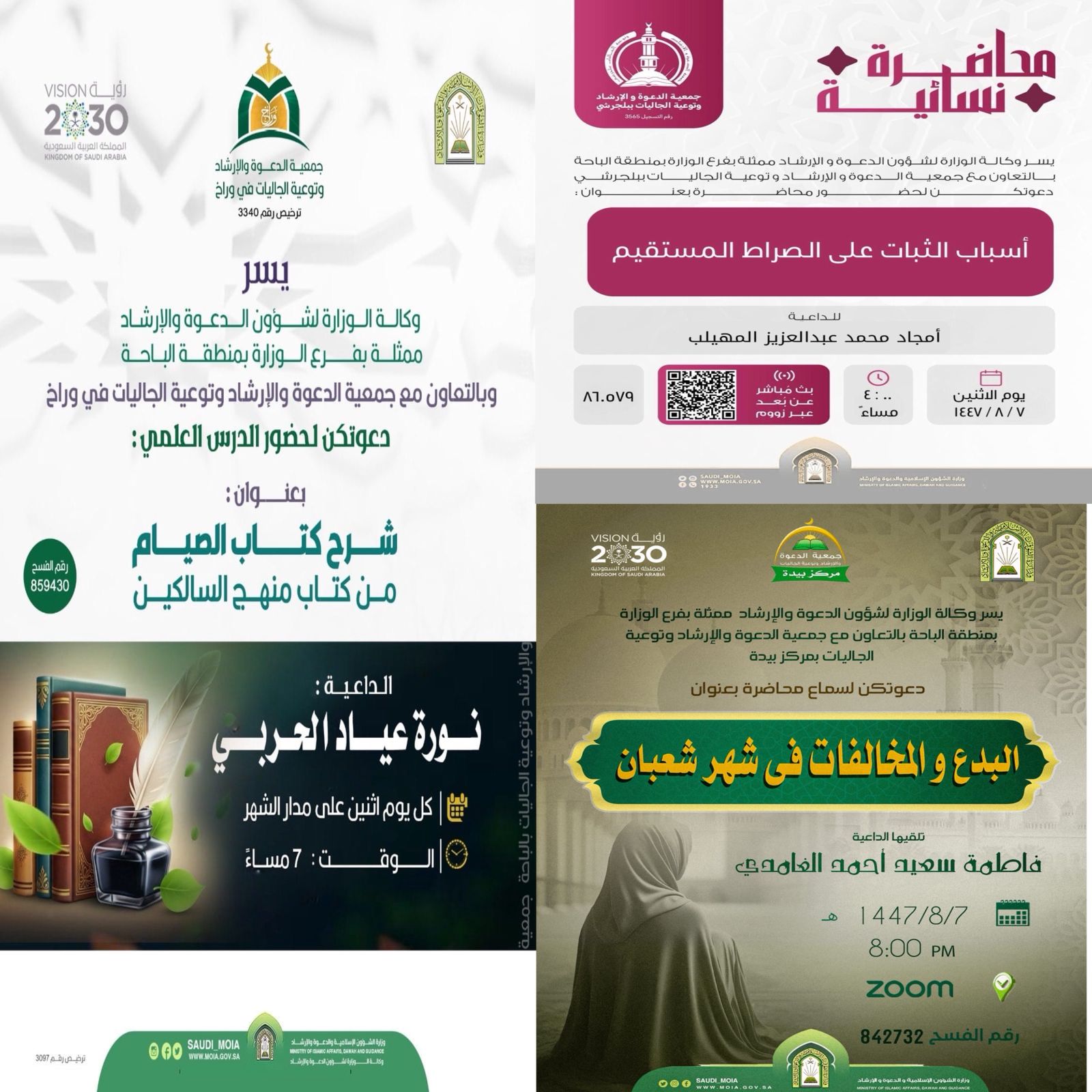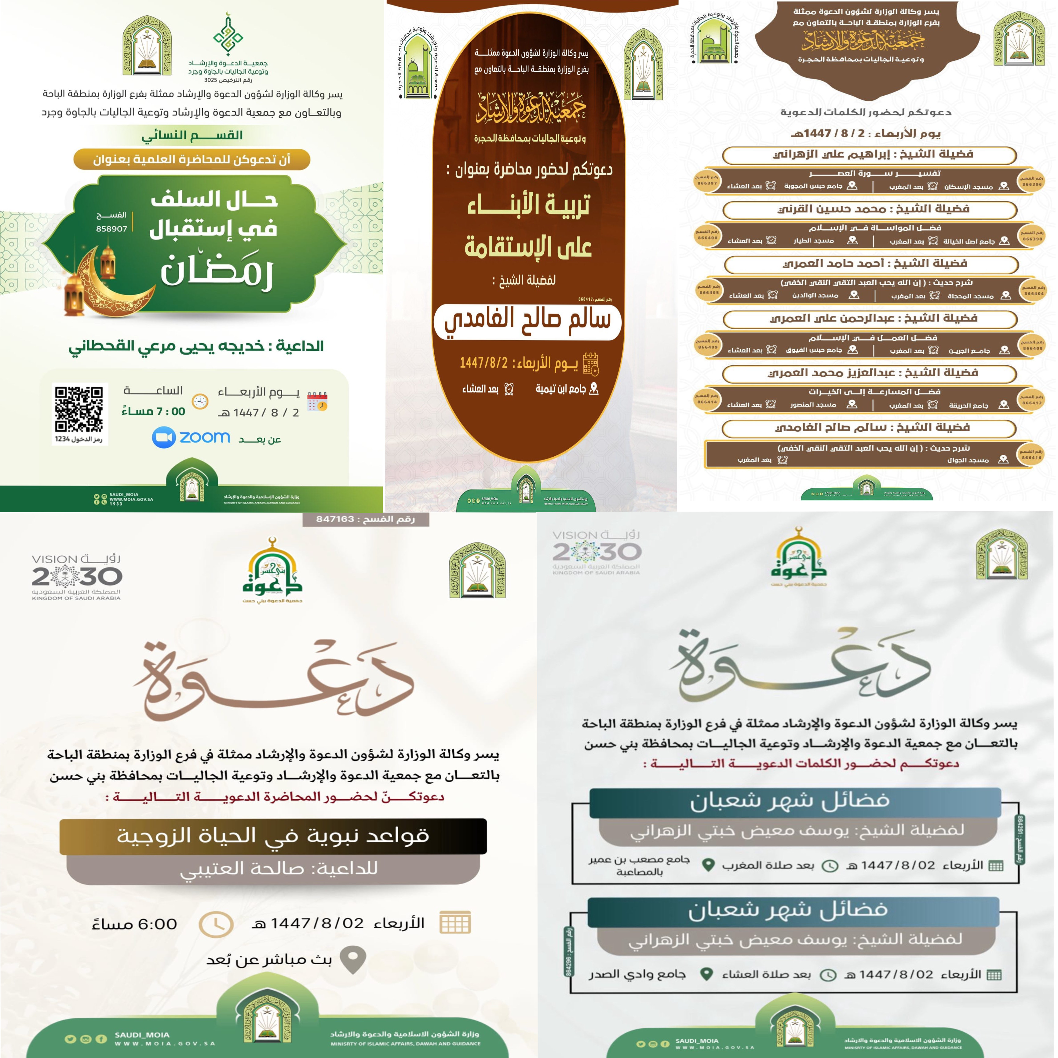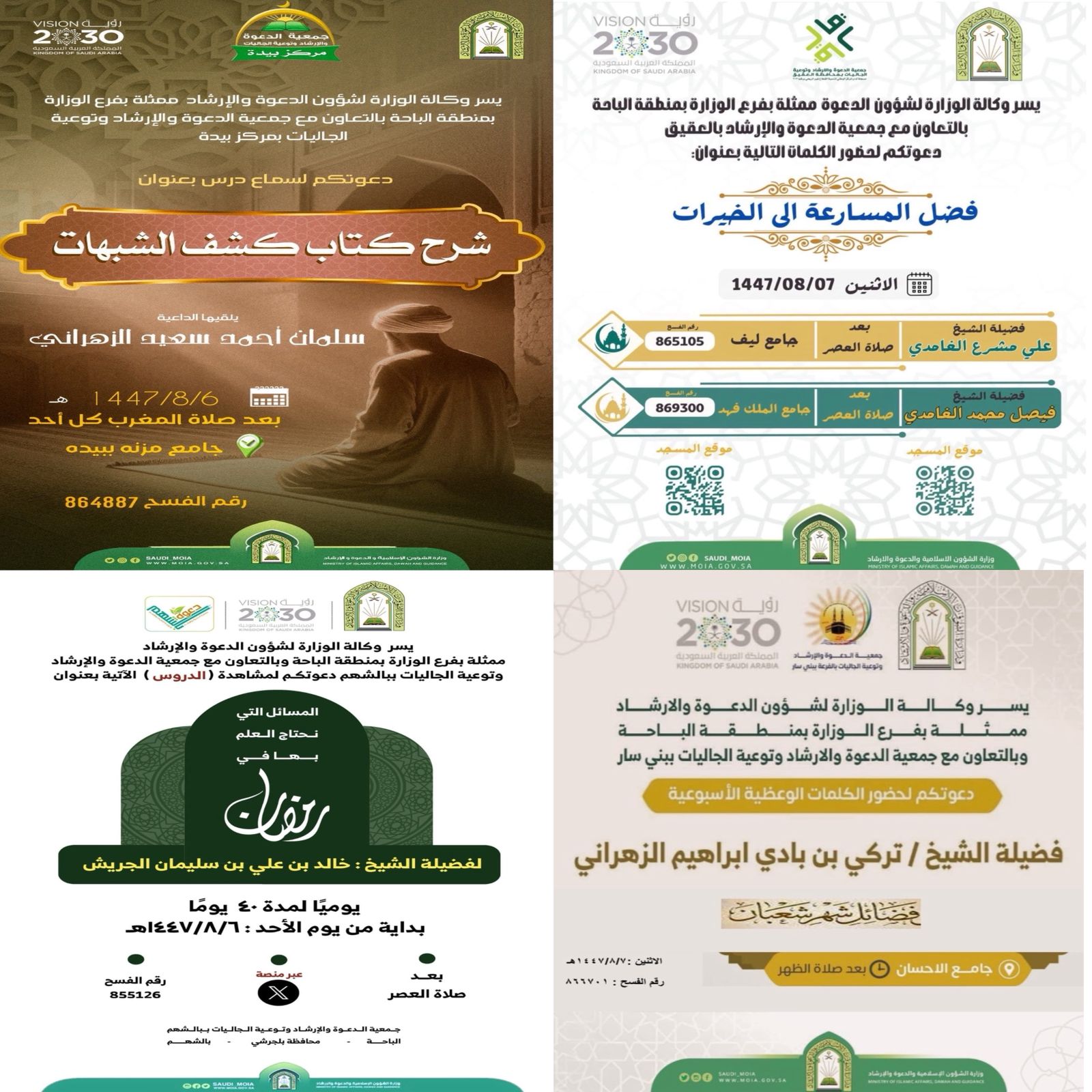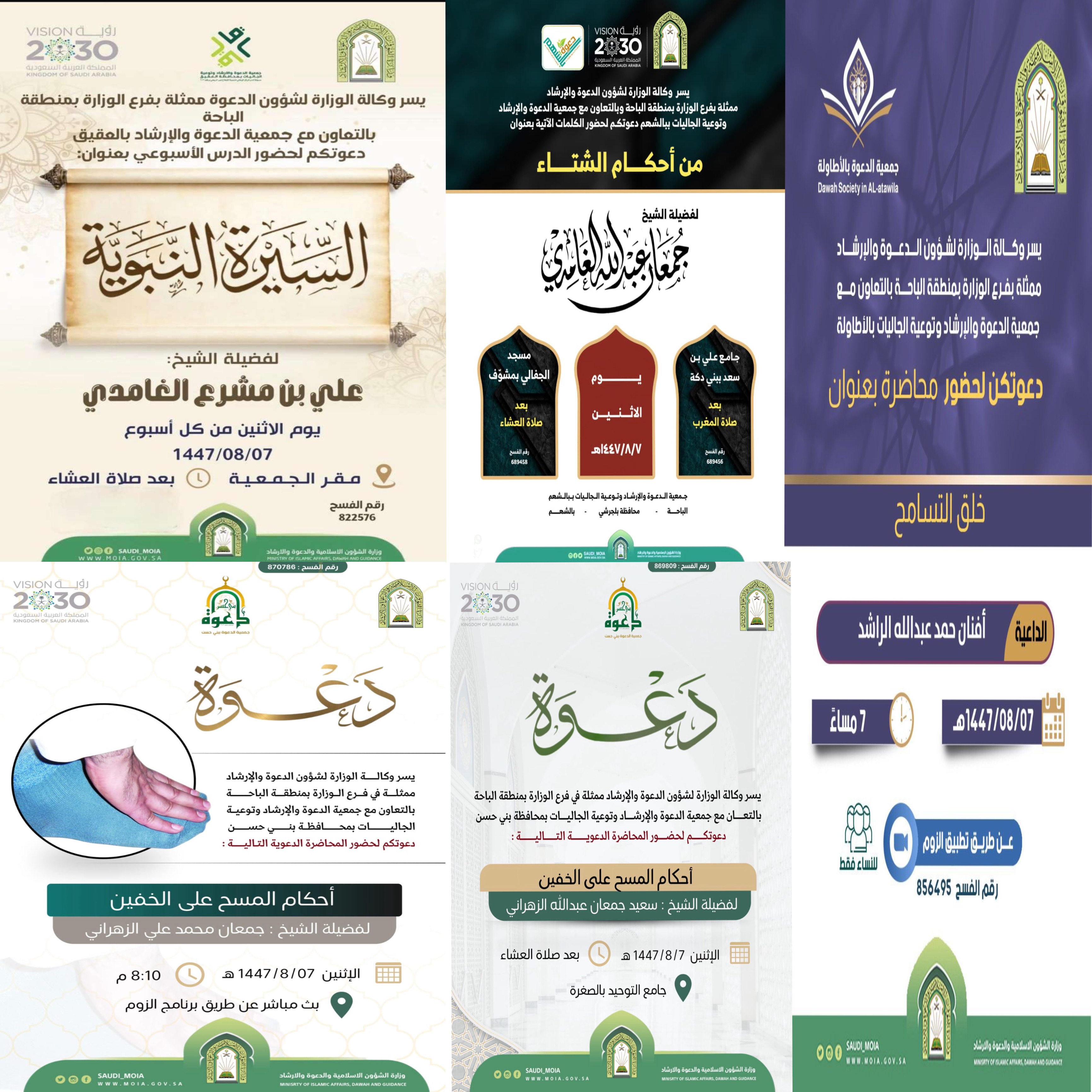 مناشط دعوية متنوعة تنفذها الشؤون الإسلامية بالباحة في عددٍ من محافظات المنطقةفي إطار جهودها المستمرة لنشر العلم الشرعي وتعزيز القيم الإسلامية، تُنفّذ وزارةُ الشؤون الإسلامية والدعوة والإرشاد، ممثَّلةً بفرعها في منطقة الباحة، وبالتعاون مع جمعيات الدعوة والإرشاد بالمنطقة ومحافظاتها، 06/شعبان/1447 التفاصيل