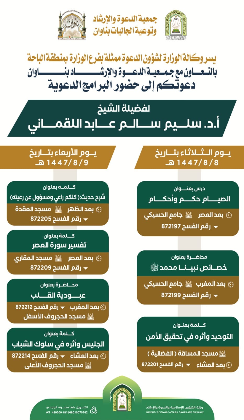 الشؤون الإسلامية بالباحة تُنفّذ كلماتٍ وعظية ودروسًا علمية بعددٍ من محافظات المنطقةتُنفّذ في وزارة الشؤون الإسلامية والدعوة والإرشاد، ممثّلةً بفرعها في منطقة الباحة، وبالتعاون مع جمعيات الدعوة والإرشاد وتوعية الجاليات بمحافظات العقيق وبني سار وبالشهم ومركز بيدة، يومي الأحد والاثنين 07/شعبان/1447 التفاصيل