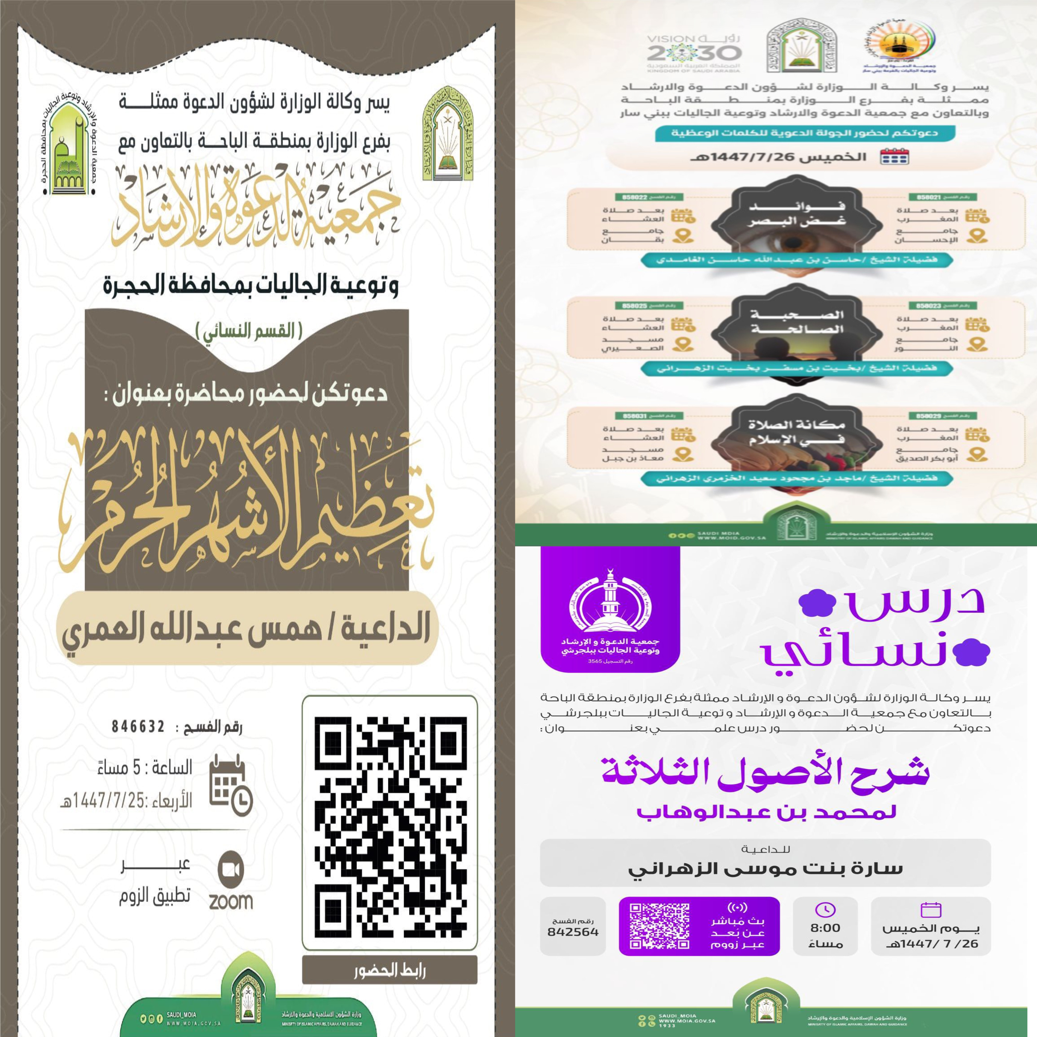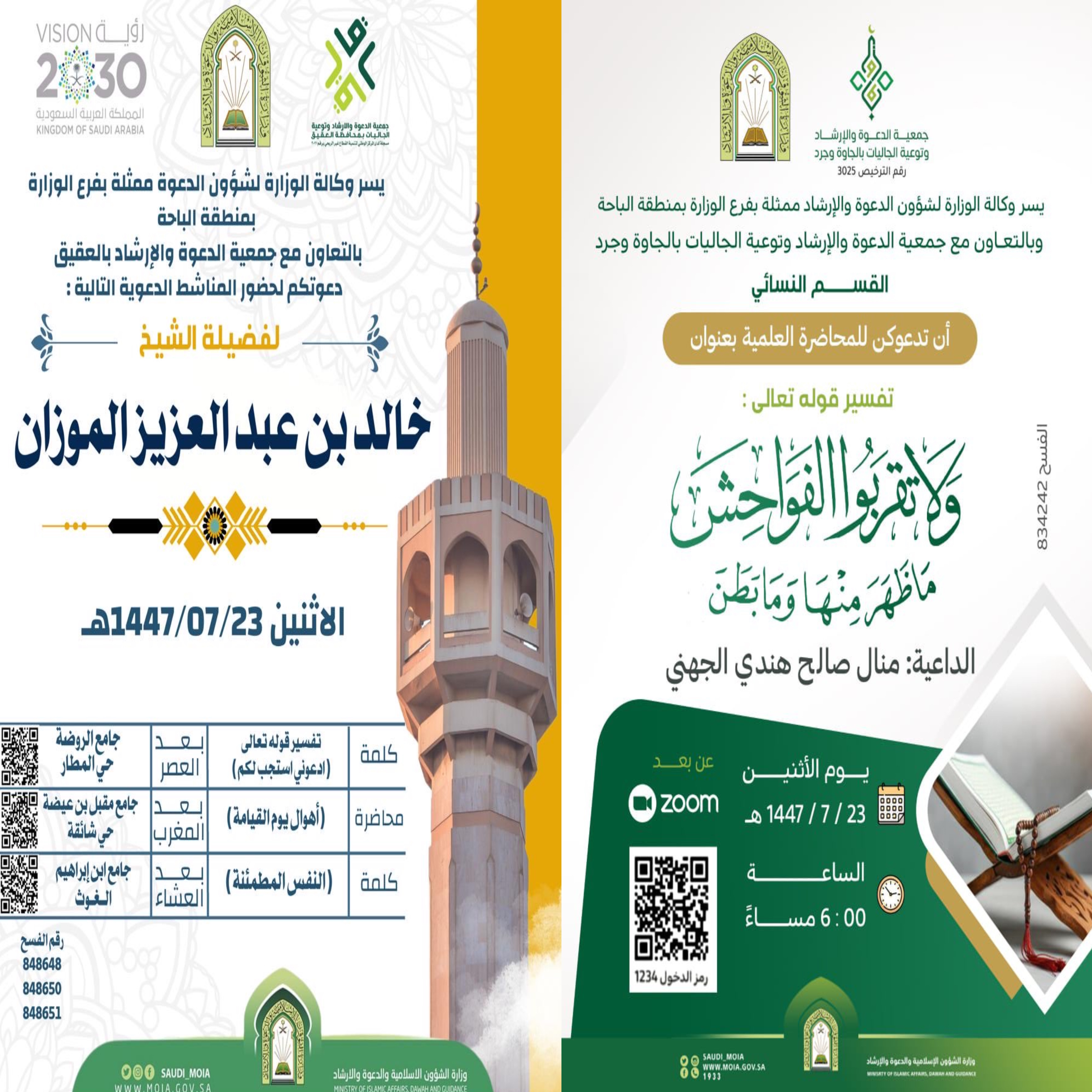 الشؤون الإسلامية بالباحة تُنفّذ مناشط دعوية نسائية عبر منصة الزووم خلال شهر شعبانتُنفّذ وزارةُ الشؤون الإسلامية والدعوة والإرشاد بمنطقة الباحة، وبالتعاون مع جمعية الدعوة والإرشاد وتوعية الجاليات في وراخ، خلال شهر شعبان لعام 1447هـ، سلسلةً من المناشط الدعوية النسائية، وذلك ضمن جهودها 30/رجب/1447 التفاصيل