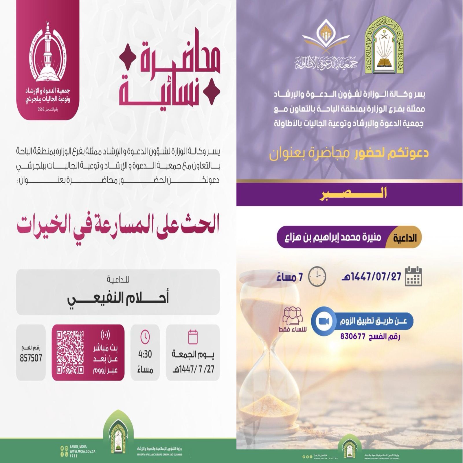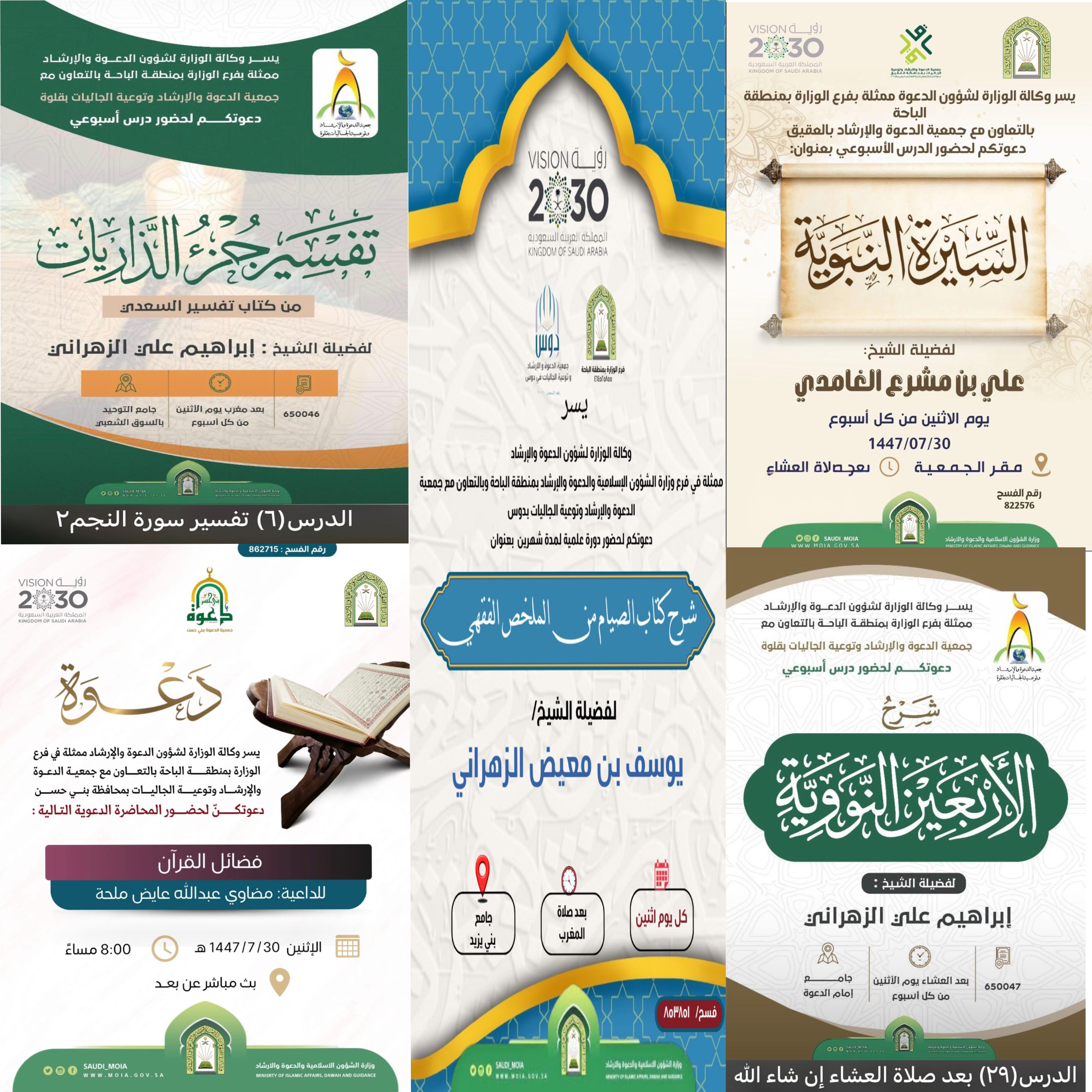 الشؤون الإسلامية بالباحة تُنظّم مناشط دعوية تشمل كلمات وعظية ومحاضرتينتُنظّم وزارةُ الشؤون الإسلامية والدعوة والإرشاد، ممثّلةً بفرعها في منطقة الباحة، وبالتعاون مع جمعيتي الدعوة والإرشاد ببناوان وبلجرشي، خلال يومي السبت والأحد 21–22 من شهر رجب لعام 1447هـ، عددًا من المناشط 22/رجب/1447 التفاصيل