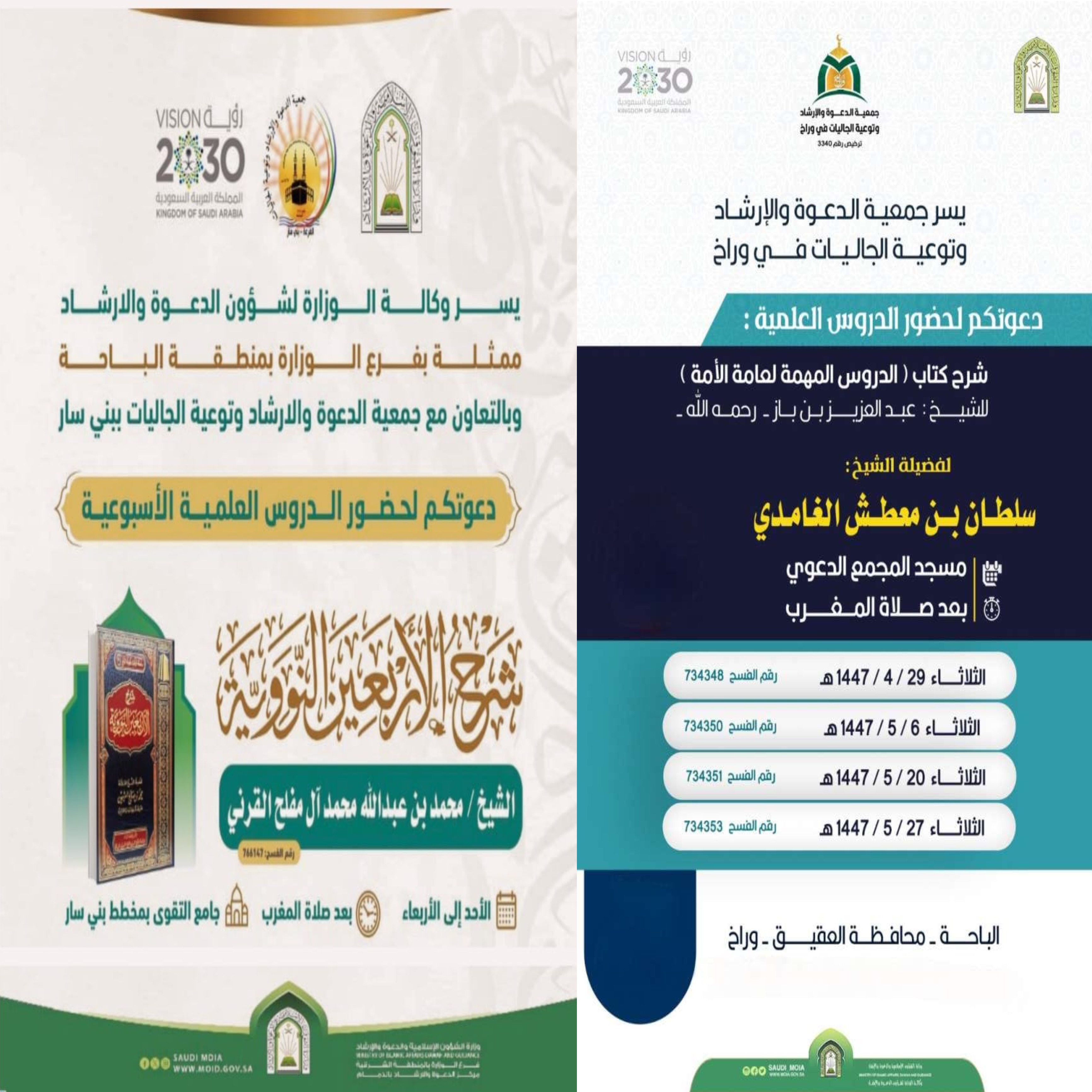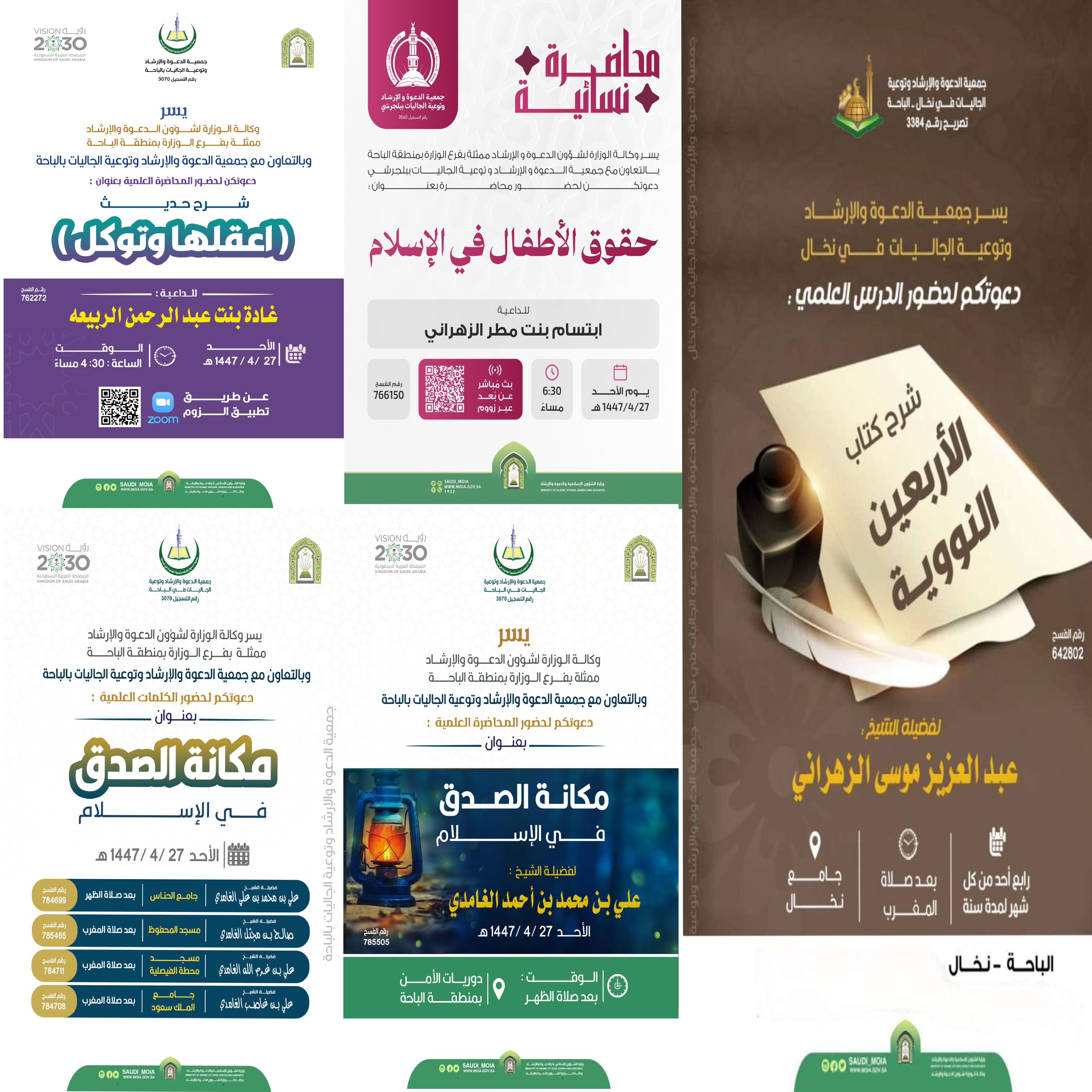 مناشط دعوية يُقيمها فرع الشؤون الإسلامية بالباحة في عددٍ من محافظات المنطقةأقام فرع وزارة الشؤون الإسلامية والدعوة والإرشاد بمنطقة الباحة بالتعاون مع جمعيات الدعوة والإرشاد وتوعية الجاليات في عددٍ من محافظات المنطقة، لـ يومي الجمعة والسبت 25–26 ربيع الآخر 1447هـ، عددًا من 27/ربيع الثاني/1447 التفاصيل