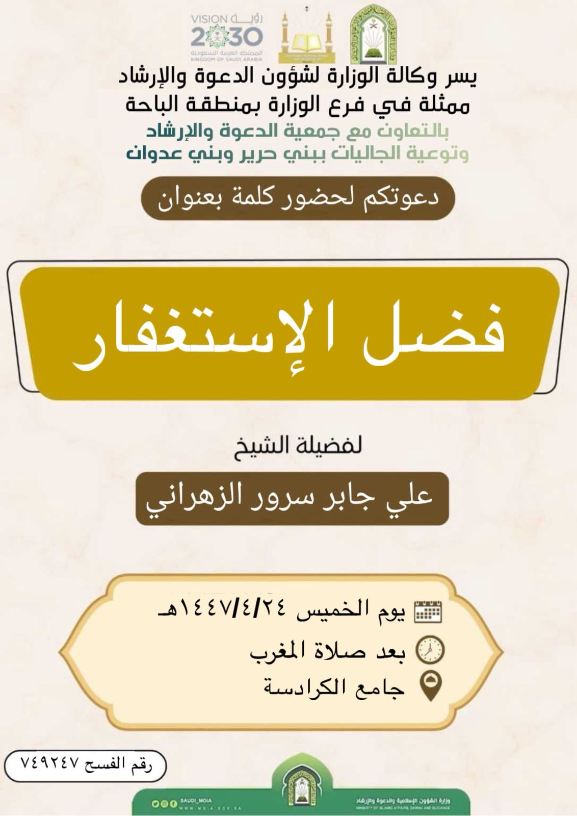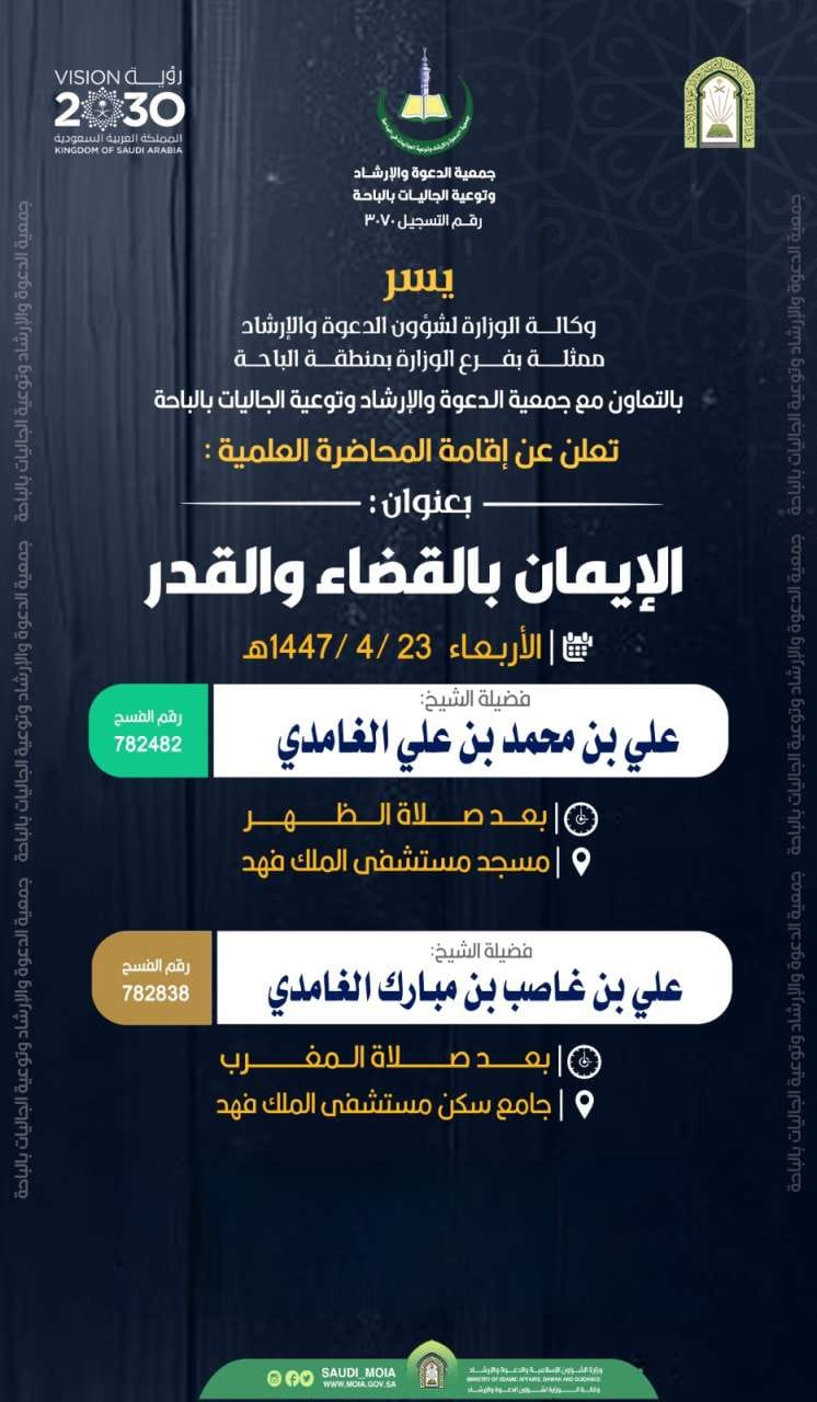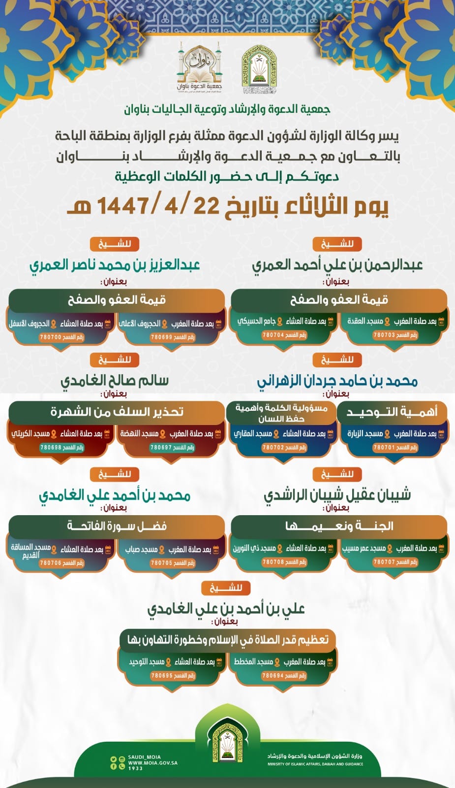 فرع الشؤون الإسلامية بالباحة ينفّذ عددًا من الكلمات الدعوية بمحافظات المنطقةينفّذ فرع وزارة الشؤون الإسلامية والدعوة والإرشاد بمنطقة الباحة وبالتعاون مع جمعيات الدعوة والإرشاد وتوعية الجاليات في الأطاولة والعقيق وبني حرير وبني عدوان ونخال يومي الخميس والجمعة 24 - 25 ربيع الآخر 24/ربيع الثاني/1447 التفاصيل