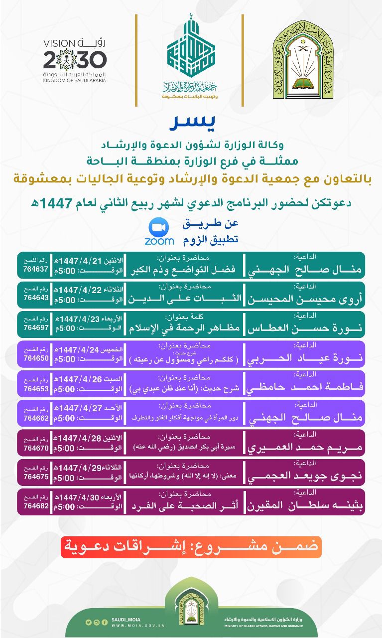 فرع الشؤون الإسلامية بالباحة يواصل تنفيذ البرنامج الدعوي النسائي بمعشوقة لشهر ربيع الآخر 1447هـيواصل فرع وزارة الشؤون الإسلامية والدعوة والإرشاد بمنطقة الباحة بالتعاون مع جمعية الدعوة والإرشاد وتوعية الجاليات بمعشوقة، تنفيذ البرنامج الدعوي النسائي خلال الفترة من الحادي والعشرين من شهر ربيع الآخر 23/ربيع الثاني/1447 التفاصيل
