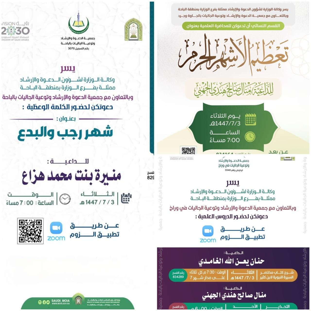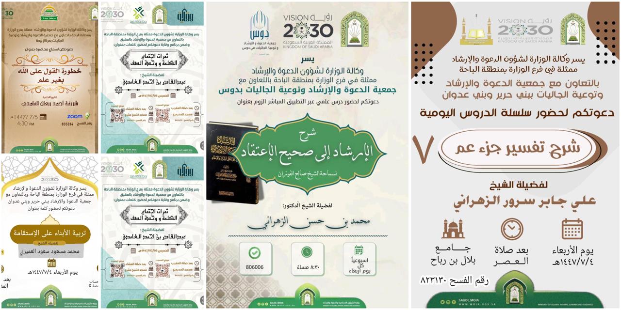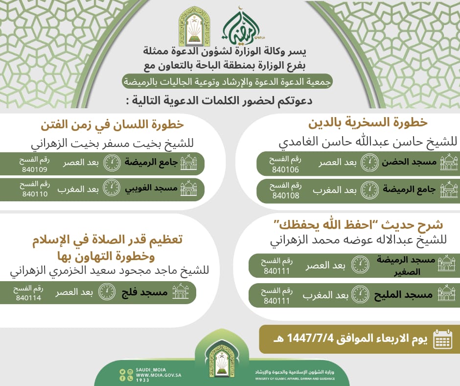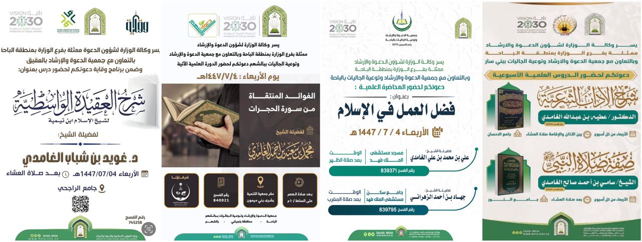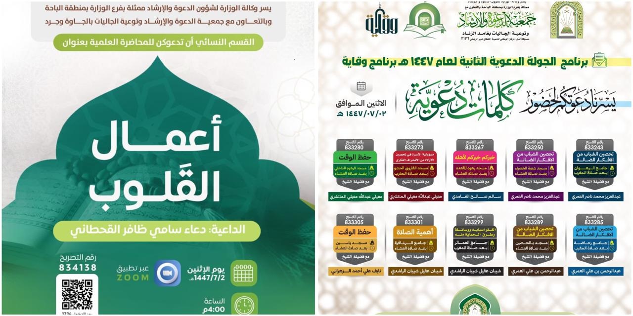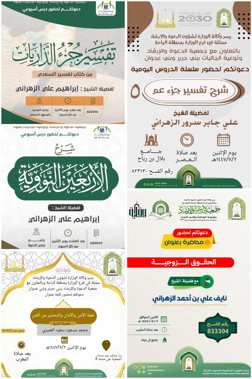 دروس ومحاضرات دعوية تُنفّذ في محافظات الباحة في الثاني من شهر رجبنفّذت وزارةُ الشؤون الإسلامية والدعوة والإرشاد، ممثّلةً بفرعها في منطقة الباحة، وبالتعاون مع جمعيات الدعوة والإرشاد في قلوة، وغامد الزناد، وبني حرير، وبني عدوان، يوم الاثنين الثاني من شهر رجب لعام 1447هـ، 04/رجب/1447 التفاصيل