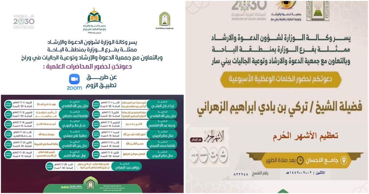سلسلة محاضرات دعوية نسائية تُنفّذها الشؤون الإسلامية بالباحة يومي 4 و5 رجبتُنفّذ وزارةُ الشؤون الإسلامية والدعوة والإرشاد، ممثّلةً بفرعها في منطقة الباحة، وبالتعاون مع جمعيات الدعوة والإرشاد في بني حرير وبني عدوان ودوس وناوان، خلال يومي الأربعاء والخميس 4 و5 من شهر رجب لعام 05/رجب/1447 التفاصيل