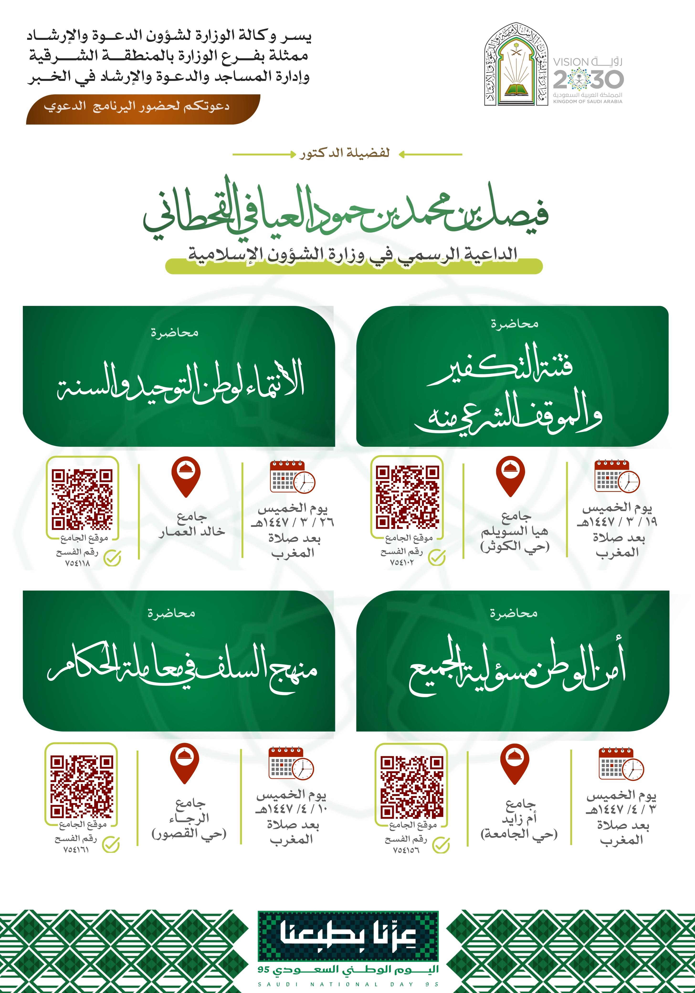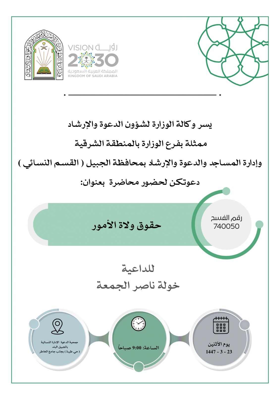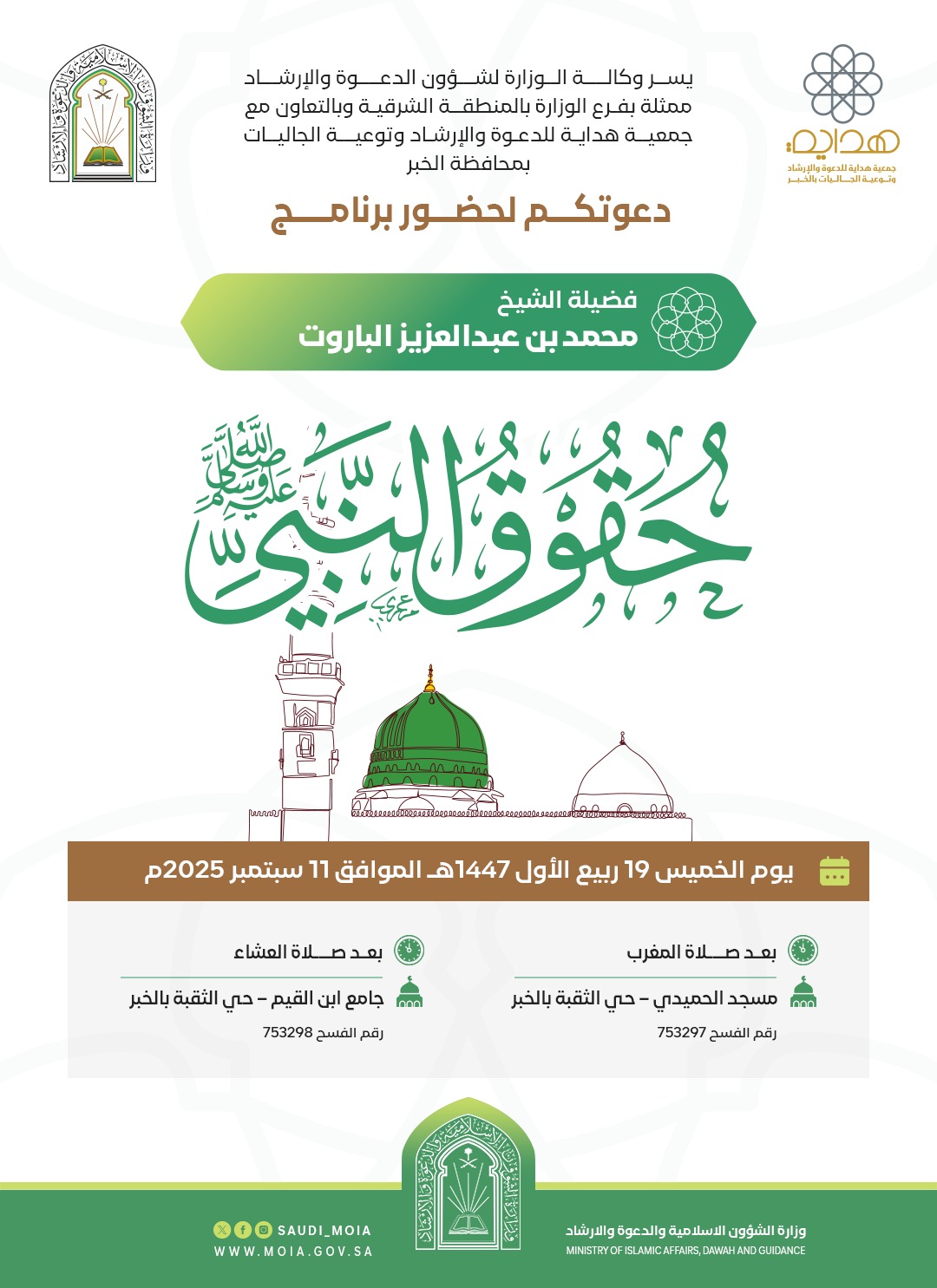 فرع الشؤون الإسلامية بالشرقية ينفذ سلسلة من المحاضرات الدعوية في الخبرينفذ فرع وزارة الشؤون الإسلامية والدعوة والإرشاد بالمنطقة الشرقية، بالتعاون مع جمعيات الدعوة والإرشاد وتوعية الجاليات بالخبر، سلسلة من المحاضرات الدعوية، تُقام كل يوم خميس خلال الفترة من 19 / 3 / 1447هـ 19/ربيع الأول/1447 التفاصيل