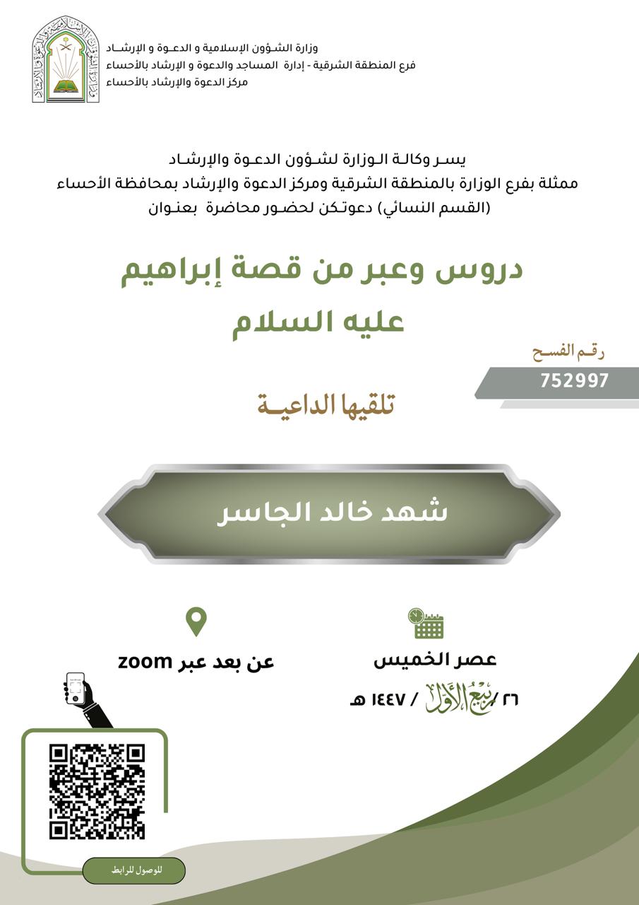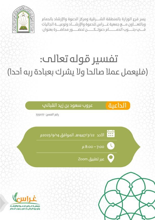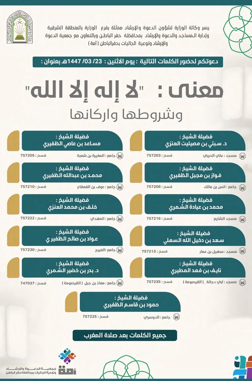 فرع الشؤون الإسلامية بالشرقية ينفذ سلسلة من المحاضرات الدعوية في الخبرينفذ فرع وزارة الشؤون الإسلامية والدعوة والإرشاد بالمنطقة الشرقية، بالتعاون مع جمعيات الدعوة والإرشاد وتوعية الجاليات بالخبر، سلسلة من المحاضرات الدعوية، تُقام كل يوم خميس خلال الفترة من 19 / 3 / 1447هـ 19/ربيع الأول/1447 التفاصيل