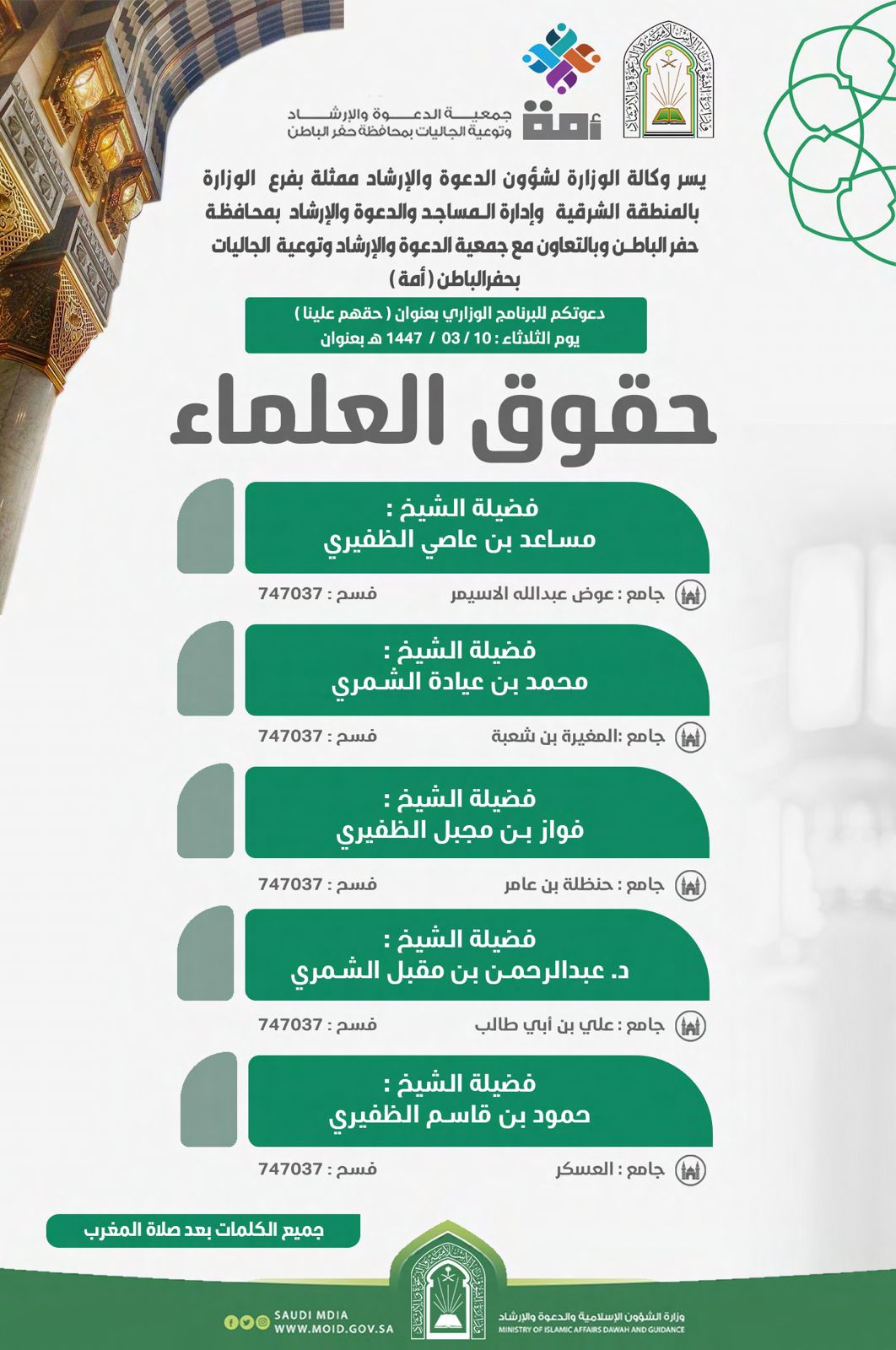 فرع الوزارة بالشرقية ينظم كلمات دعوية ضمن برنامج “حقهم علينا” بحفر الباطننظم فرع وزارة الشؤون الإسلامية والدعوة والإرشاد، في المنطقة الشرقية ممثلاً في إدارة المساجد والدعوة والإرشاد بمحافظة حفر الباطن، وبالتعاون مع جمعية الدعوة والإرشاد وتوعية الجاليات بالمحافظة (أمة)، يوم 10/ربيع الأول/1447 التفاصيل