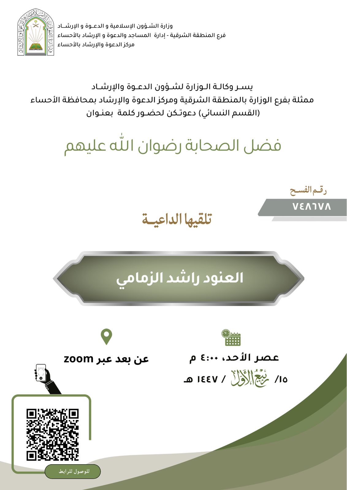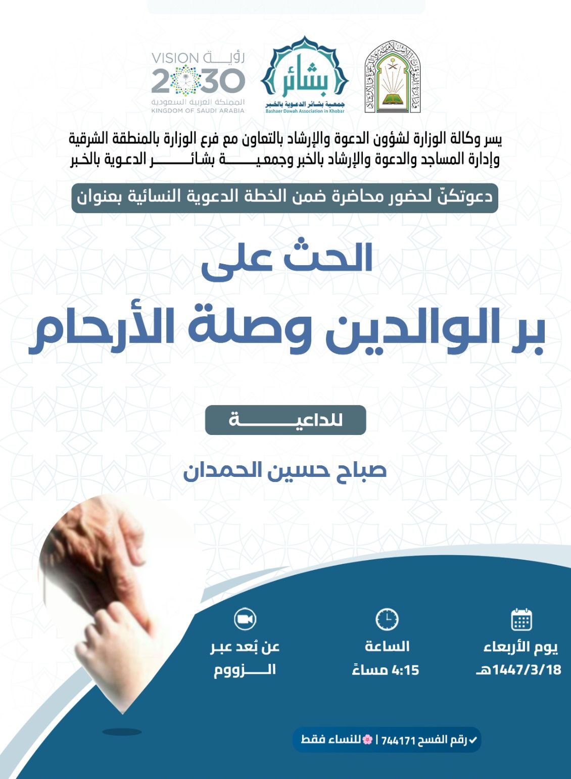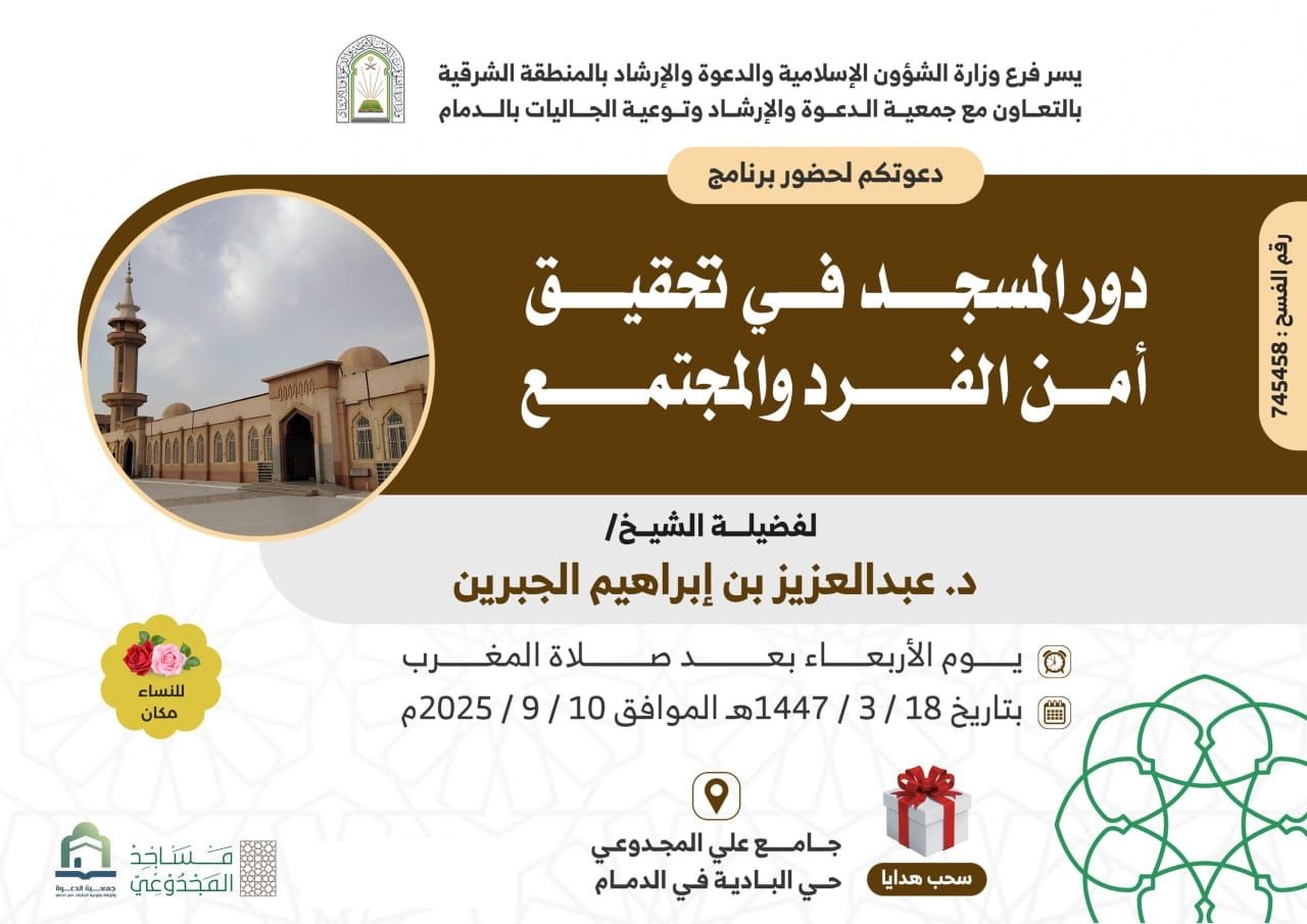 الشؤون الإسلامية بالشرقية تنظم سلسلة محاضرات بالخبر والدمامينظّم فرع وزارة الشؤون الإسلامية والدعوة والإرشاد بالمنطقة الشرقية، بالتعاون مع جمعية الدعوة والإرشاد وتوعية الجاليات، سلسلة من المحاضرات تحت عنوان “تربية الأولاد على الهدي النبوي”، حيث تقام في عدد من 16/ربيع الأول/1447 التفاصيل