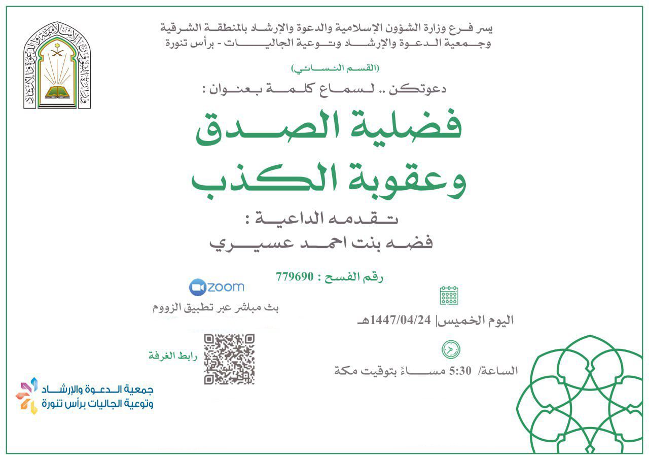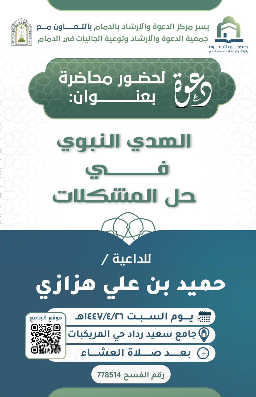 الشؤون الإسلامية في المنطقة الشرقية تنفذ سلسلة من المحاضرات الدعوية النسائية بمحافظة حفرالباطنينفذ فرع وزارة الشؤون الإسلامية والدعوة والإرشاد بالمنطقة الشرقية، ممثلاً بإدارة المساجد والدعوة والإرشاد بمحافظة حفرالباطن، سلسلة من المحاضرات الدعوية النسائية، خلال الفترة الثالث والعشرين وحتى الثلاثين 23/ربيع الثاني/1447 التفاصيل
