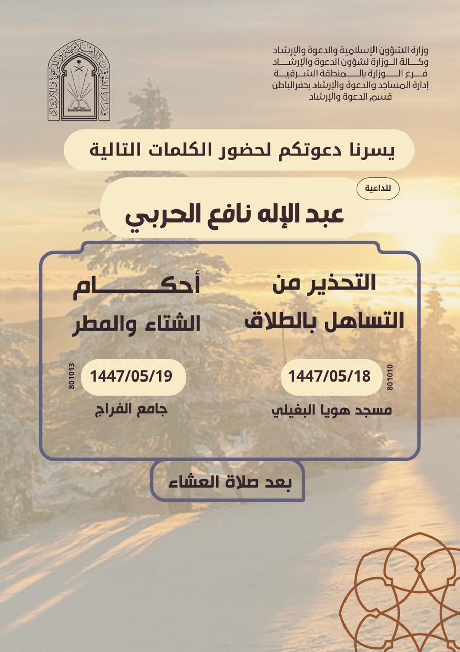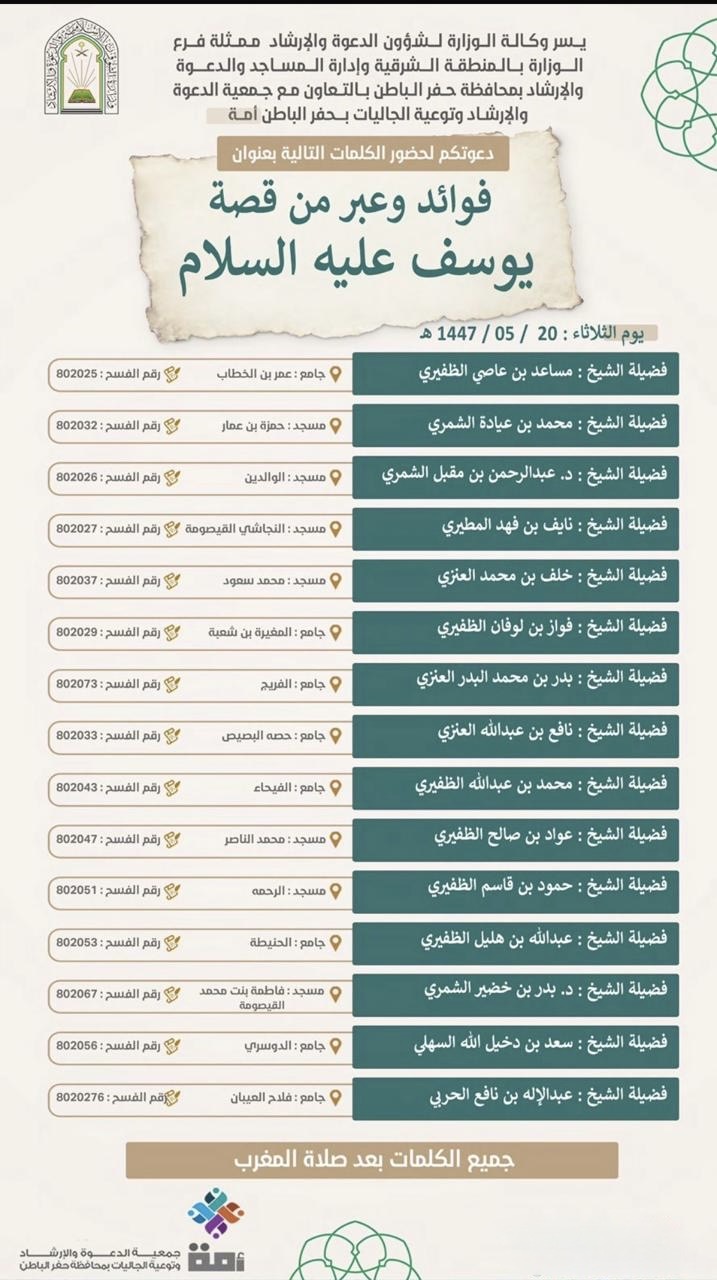فرع الشؤون الإسلامية بالشرقية ينفذ سلسلة من المحاضرات الدعوية بحفر الباطننفّذ فرع وزارة الشؤون الإسلامية والدعوة والإرشاد بالمنطقة الشرقية، ممثلاً بإدارة المساجد والدعوة والإرشاد بمحافظة حفر الباطن، سلسلة من المحاضرات الدعوية الموجهة للرجال والنساء، وذلك خلال الفترة من الأحد 19/جمادى الأولى/1447 التفاصيل
