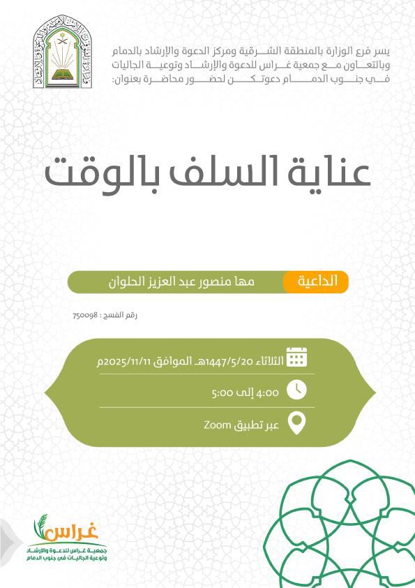 فرع الشؤون الإسلامية بالشرقية ينفذ سلسلة محاضرات دعوية وتربوية بمحافظة رأس تنورة ومدينة الدمامنفذ فرع وزارة الشؤون الإسلامية والدعوة والإرشاد بالمنطقة الشرقية، وبالتعاون مع جمعيات الدعوة والإرشاد وتوعية الجاليات بمحافظة رأس تنورة ومدينة الدمام، يوم الثلاثاء العشرين من جمادى الأولى لعام 20/جمادى الأولى/1447 التفاصيل