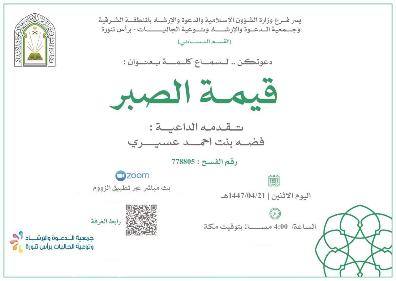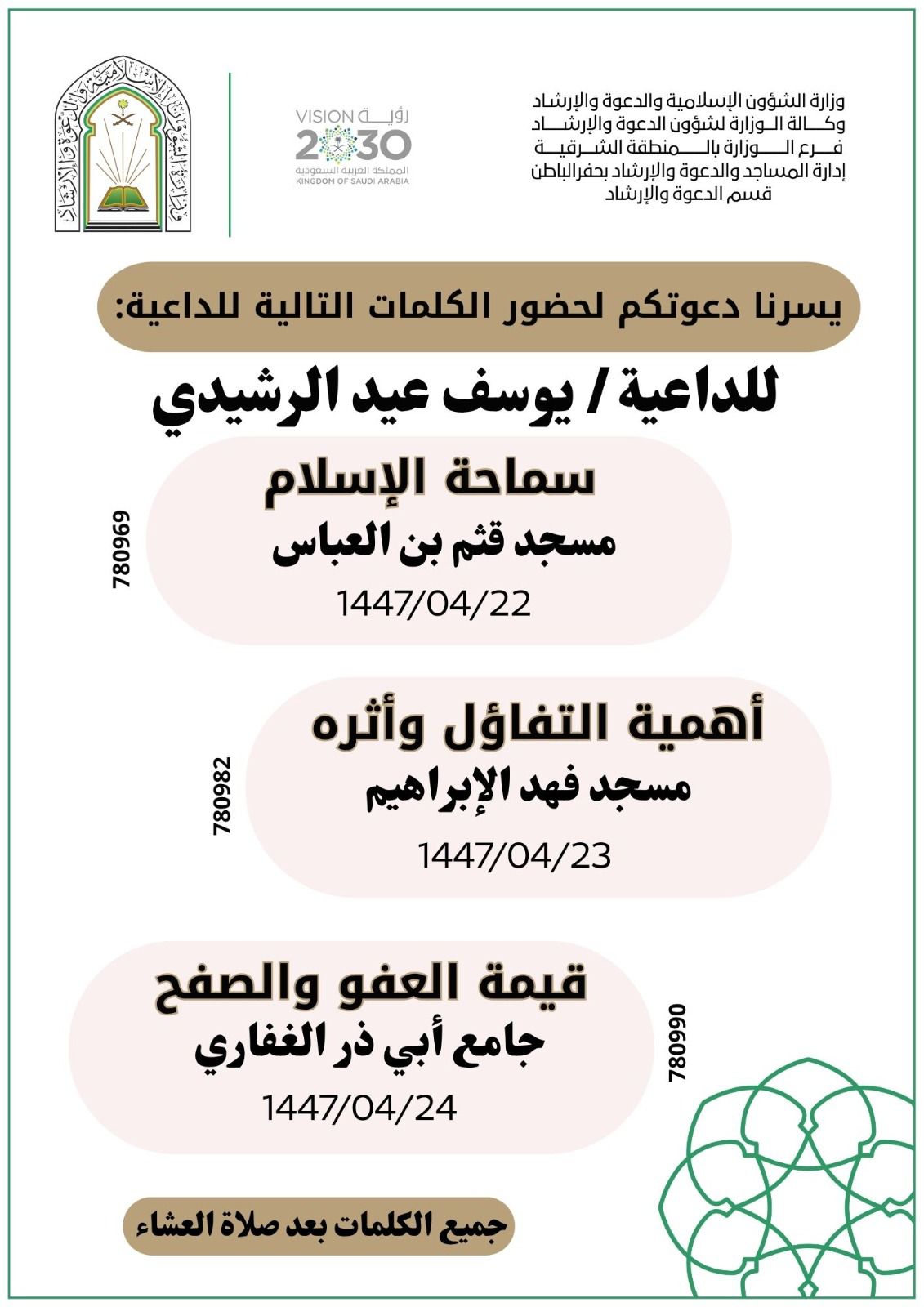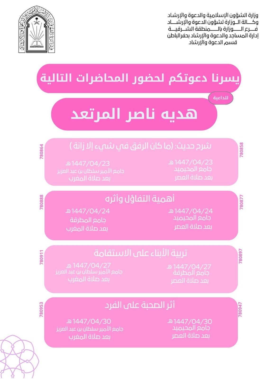 الشؤون الإسلامية في المنطقة الشرقية تنفذ سلسلة من المحاضرات الدعوية النسائية بمحافظة حفرالباطنينفذ فرع وزارة الشؤون الإسلامية والدعوة والإرشاد بالمنطقة الشرقية، ممثلاً بإدارة المساجد والدعوة والإرشاد بمحافظة حفرالباطن، سلسلة من المحاضرات الدعوية النسائية، خلال الفترة الثالث والعشرين وحتى الثلاثين 23/ربيع الثاني/1447 التفاصيل