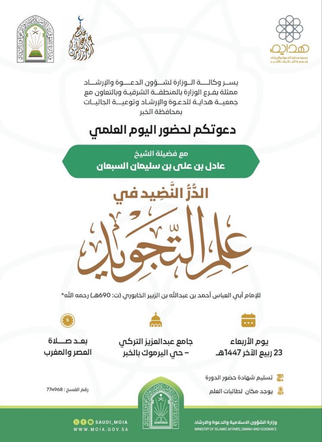 فرع الشؤون الإسلامية بالشرقية ينفذ سلسلة من المحاضرات الدعوية النسائية براس تنورة والأحساء والدمام عن بعدينفذ فرع وزارة الشؤون الإسلامية والدعوة والإرشاد بالمنطقة الشرقية، ممثلاً بإدارة المساجد والدعوة والإرشاد بالأحساء وبالتعاون مع جمعيات الدعوة والإرشاد وتوعية الجاليات بمحافظة رأس تنورة ومدينة الدمام، 22/ربيع الثاني/1447 التفاصيل