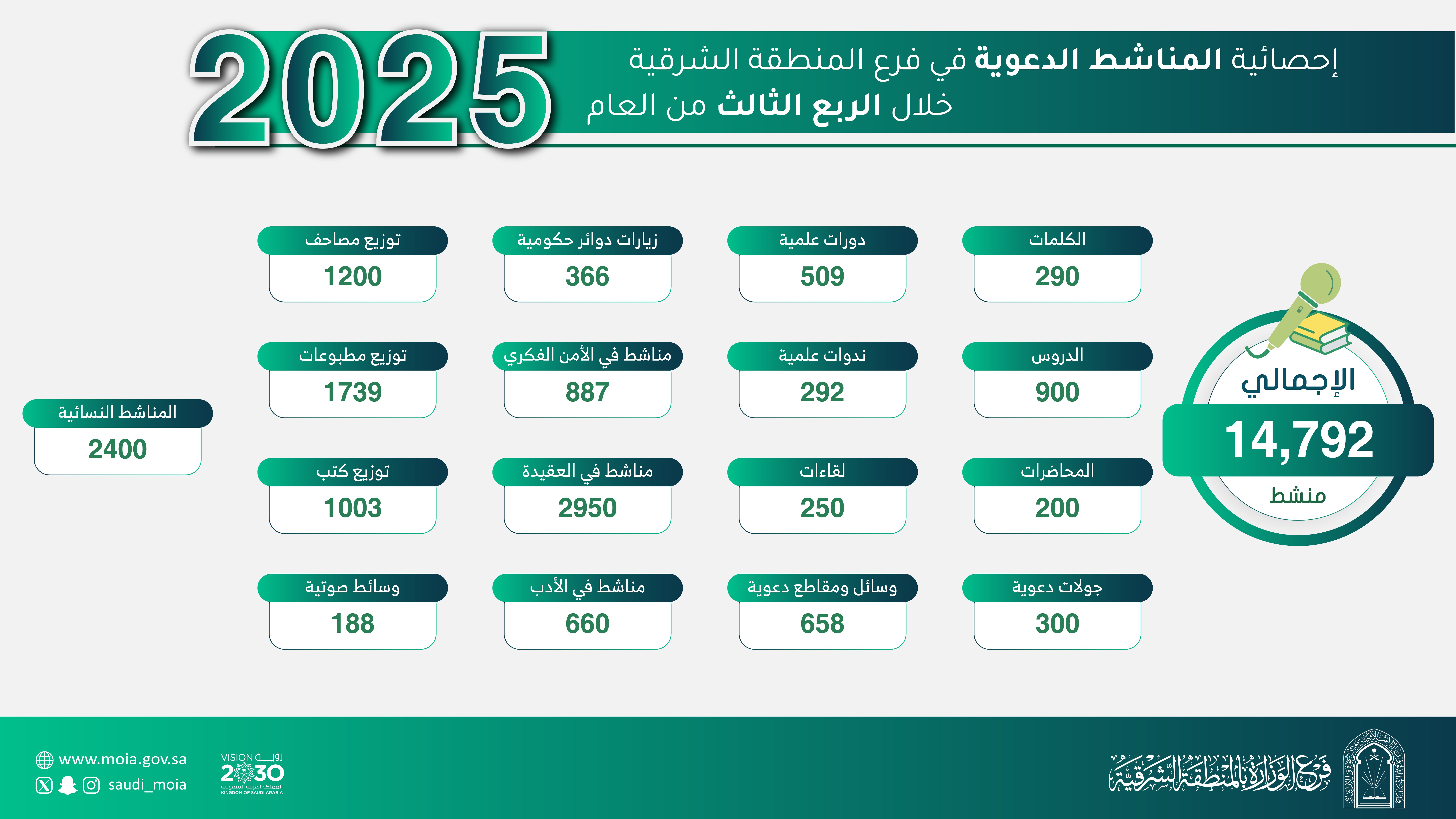 فرع الشؤون الإسلامية بالشرقية ينفّذ 14,792 منشطاً دعوياً خلال الربع الثالث لعام 2025منفّذ فرع وزارة الشؤون الإسلامية والدعوة والإرشاد بالمنطقة الشرقية، ممثلاً بإدارة الدعوة والإرشاد، خلال الربع الثالث من عام 2025م، (14,792) منـشطاً دعوياً متنوعاً في مختلف محافظات المنطقة، ضمن خطة الفرع 21/ربيع الثاني/1447 التفاصيل
