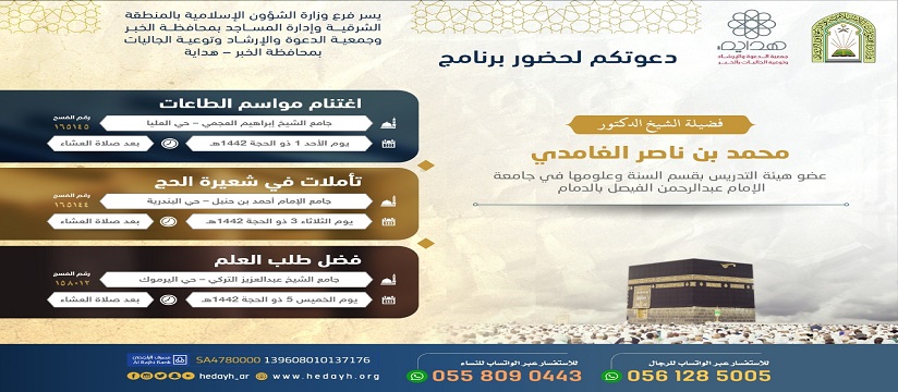 دروس علمية بالمنطقة الشرقيةينظم فرع الوزارة بالمنطقة الشرقية بالتعاون مع جمعية الدعوة والإرشاد وتوعية الجاليات بمحافظة الخبر "هداية"، اليوم، درس أسبوعي كل يوم ثلاثاء بعنوان: (مسائل في علوم القرآن تحرير وتفصيل) يلقيه 17/ذو الحجة/1442 التفاصيل