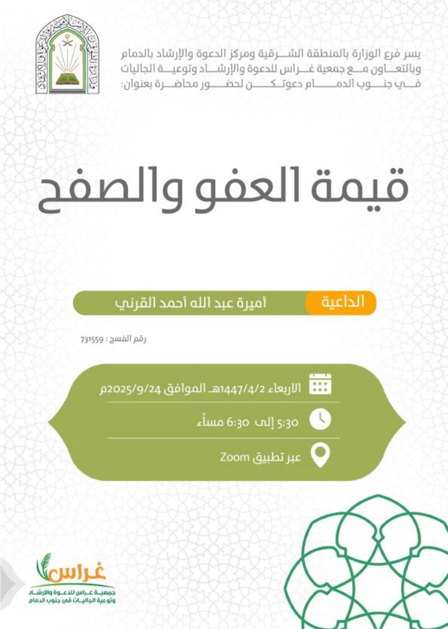 فرع الشؤون الإسلامية بالشرقية ينفذ مناشط دعوية في الدمامينفذ فرع وزارة الشؤون الإسلامية والدعوة والإرشاد بالمنطقة الشرقية، بالتعاون مع جمعية الدعوة والإرشاد وتوعية الجاليات بالدمام، اليوم الأربعاء الثاني من شهر ربيع الآخر 1447هـ، ندوة علمية بعنوان: "لزوم 02/ربيع الثاني/1447 التفاصيل