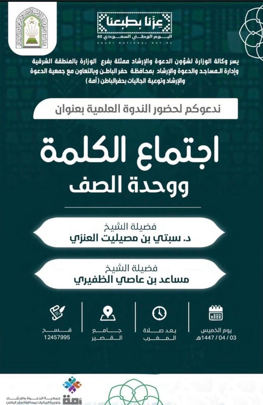 فرع الشؤون الإسلامية بالشرقية ينفذ ندوة توعوية بعنوان "اجتماع الكلمة ووحدة الصف" تزامناً مع اليوم الوطني بحفر الباطنيُنفذ فرع وزارة الشؤون الإسلامية والدعوة والإرشاد بالمنطقة الشرقية، بالتعاون مع جمعية الدعوة والإرشاد وتوعية الجاليات (آمّة) بمحافظة حفر الباطن، مساء اليوم الخميس الثالث من شهر ربيع الآخر 1447هـ، ندوة 03/ربيع الثاني/1447 التفاصيل