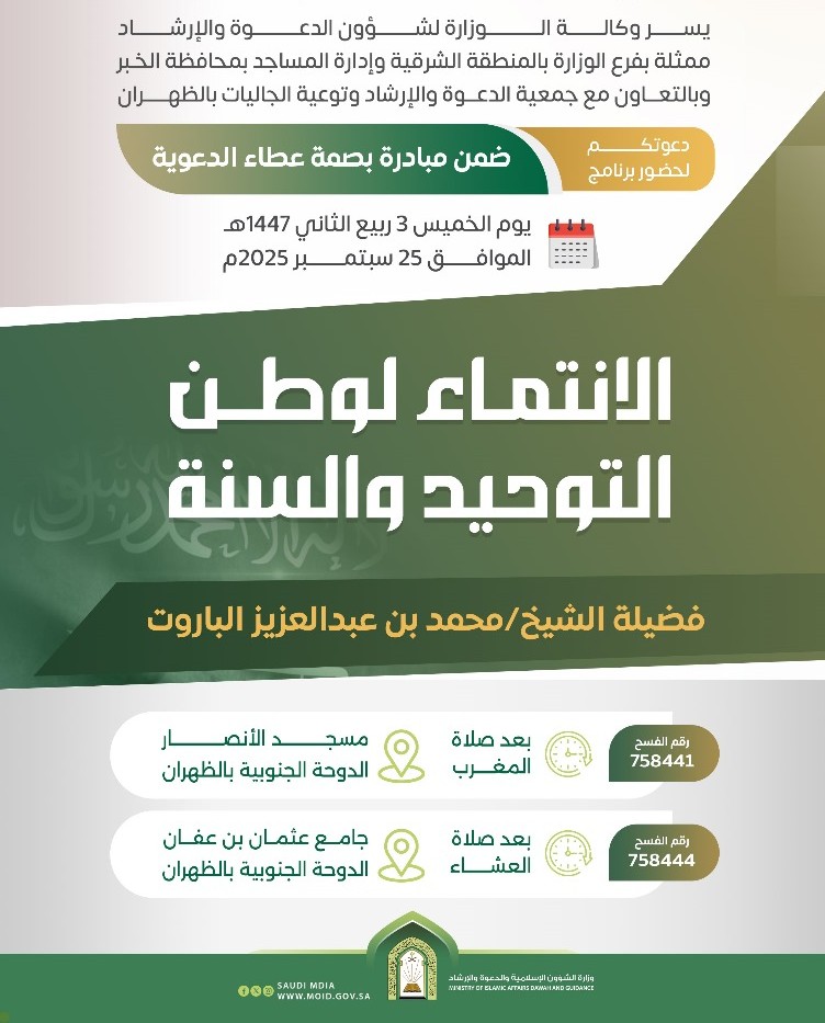 فرع الشؤون الإسلامية بالشرقية ينفذ ندوة توعوية بعنوان الانتماء لوطن التوحيد والسنة بالتزامن مع اليوم الوطني الـ95 في الظهراننفذ فرع وزارة الشؤون الإسلامية والدعوة والإرشاد بالمنطقة الشرقية، ممثلاً بإدارة المساجد والدعوة والإرشاد بمحافظة الخبر، وبالتعاون مع جمعية الدعوة والإرشاد وتوعية الجاليات بالظهران، مساء الخميس 3 ربيع 03/ربيع الثاني/1447 التفاصيل