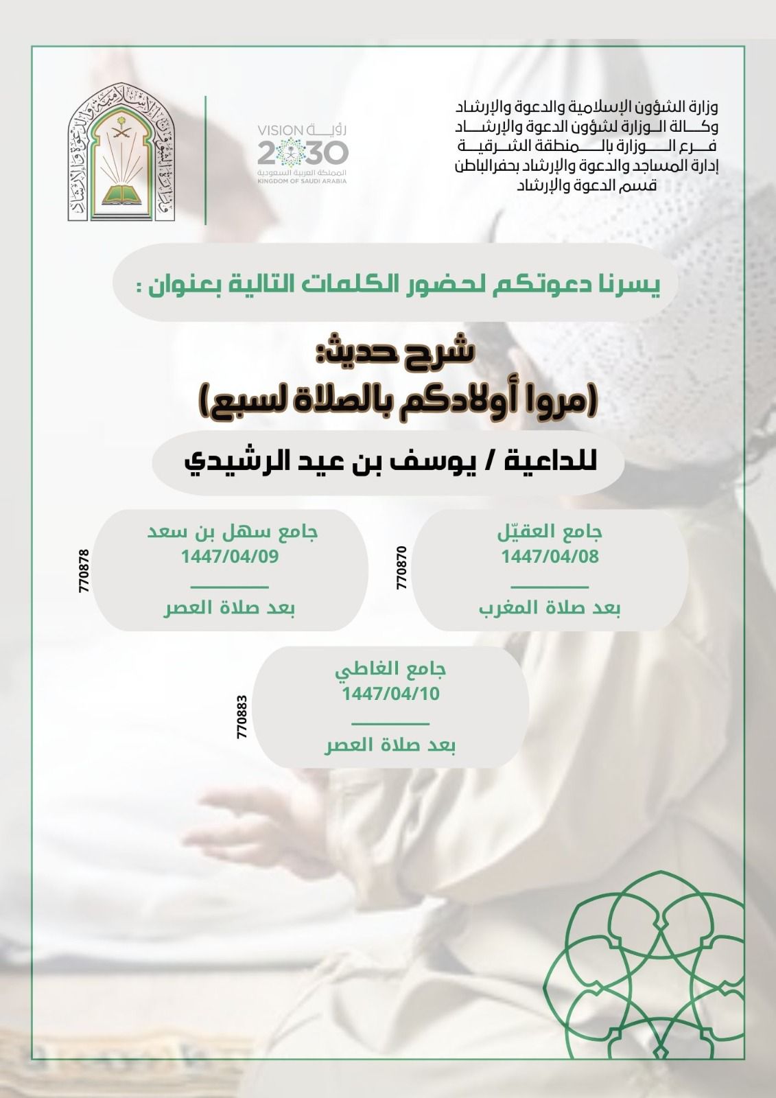 "الشؤون الإسلامية" بالشرقية تنفذ كلمة دعوية عن أهمية الصلاة وتربية الأبناء عليها بحفر الباطنينفذ فرع وزارة الشؤون الإسلامية والدعوة والإرشاد بالمنطقة الشرقية، ممثلاً بإدارة المساجد والدعوة والإرشاد بمحافظة حفر الباطن، كلمة دعوية تحت عنوان: (مُروا أولادكم بالصلاة لسبع)، حيث تقام الكلمة في 07/ربيع الثاني/1447 التفاصيل
