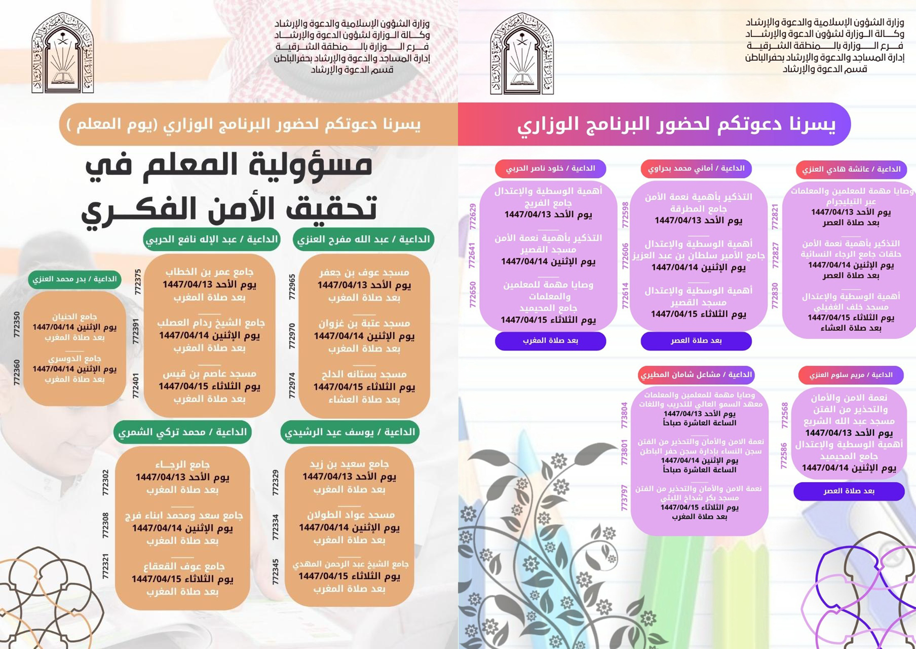 فرع الشؤون الإسلامية بالشرقية ينفذ برنامج دعوي ليوم المعلم بحفر الباطنينفذ فرع وزارة الشؤون الإسلامية والدعوة والإرشاد بالمنطقة الشرقية، ممثلاً بإدارة المساجد والدعوة والإرشاد" بمحافظة حفر الباطن، البرنامج الدعوي "يوم المعلم" تحت عنوان: "مسؤولية 10/ربيع الثاني/1447 التفاصيل