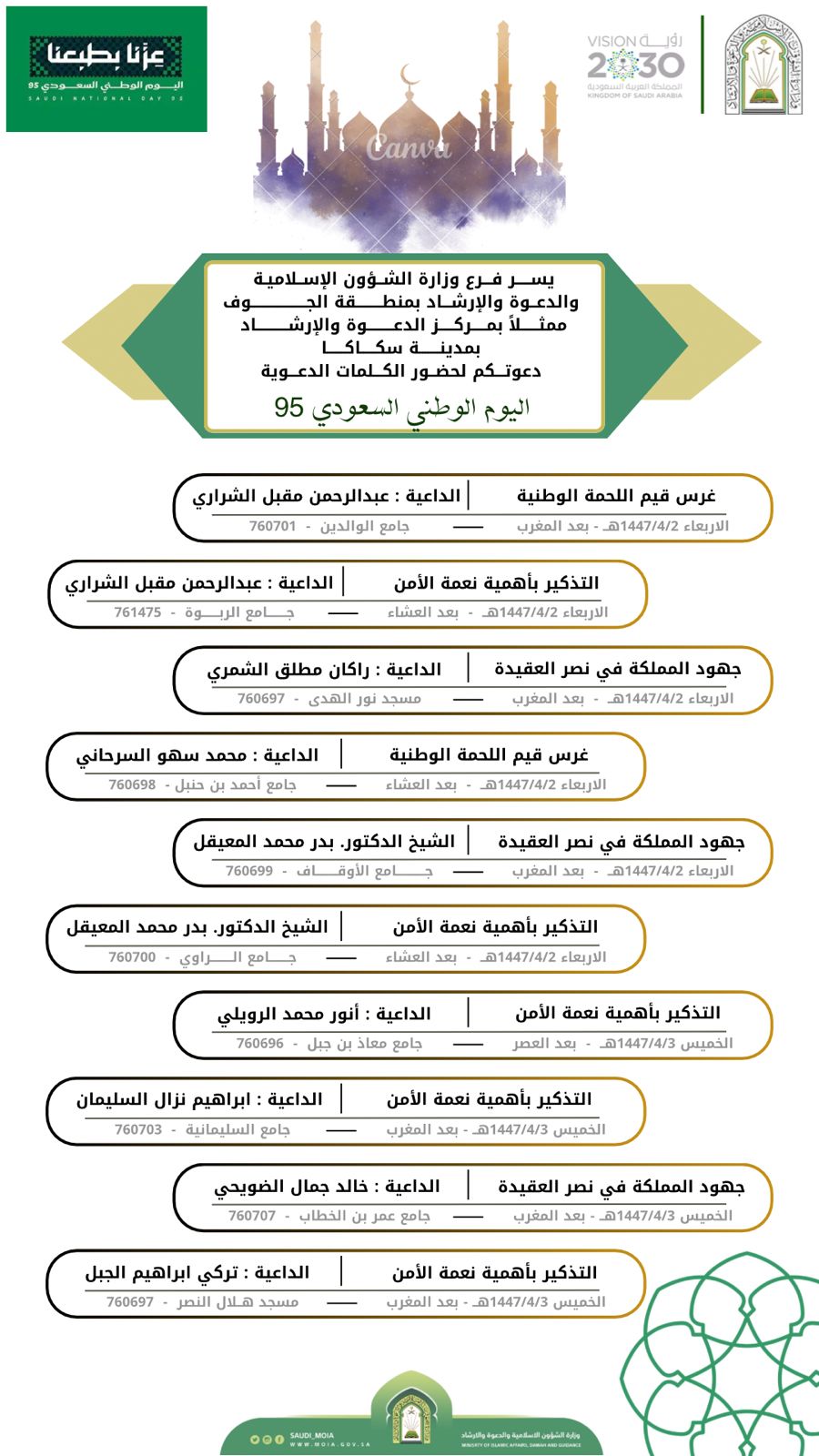 الشؤون الإسلامية بالجوف تنفذ برامج دعوية نسائية في سكاكانفّذ فرع وزارة الشؤون الإسلامية والدعوة والإرشاد بمنطقة الجوف، ممثلاً بمركز الدعوة في سكاكا، سلسلة من البرامج الدعوية الموجّهه للنساء، خلال يومي الثلاثاء والأربعاء الموافق 24 – 25 / 3 / 1447هـ. ففي 26/ربيع الأول/1447 التفاصيل
