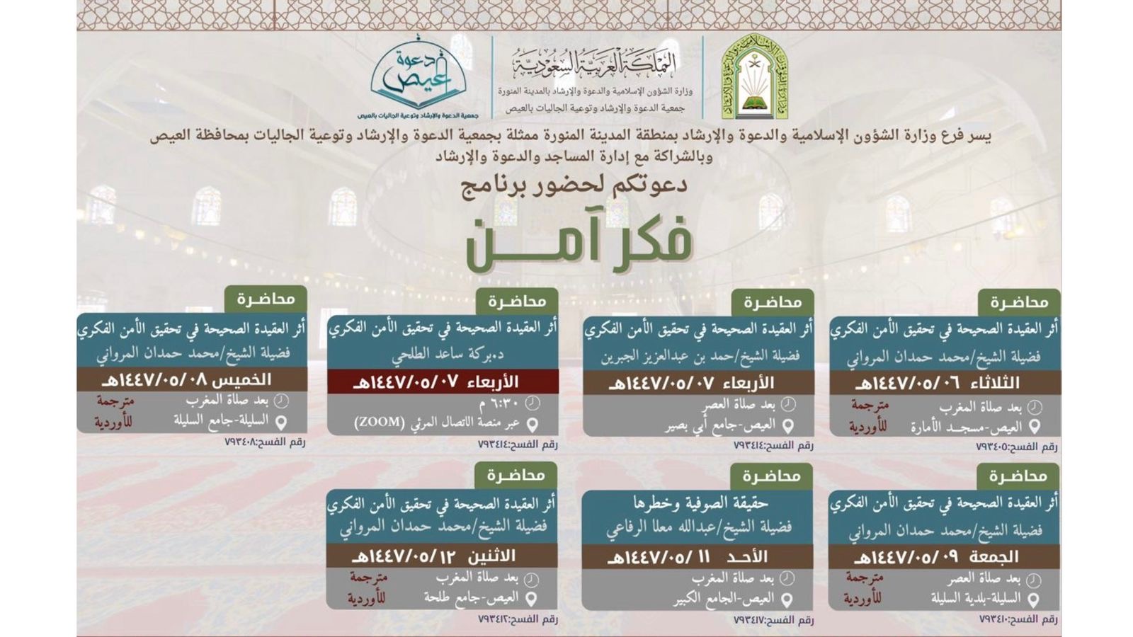 فرع الشؤون الإسلامية بالمدينة ينفذ سلسلة من المحاضرات الدعوية بمحافظة العيصنفذ فرع وزارة الشؤون الاسلامية والدعوة والإرشاد بالمدينة المنورة، ممثلا بإدارة المساجد بمحافظة العيص وبالتعاون مع جمعية الدعوة والإرشاد وتوعية الجاليات بالمحافظة، يومي الثلاثاء والاربعاء السادس والسابع 08/جمادى الأولى/1447 التفاصيل