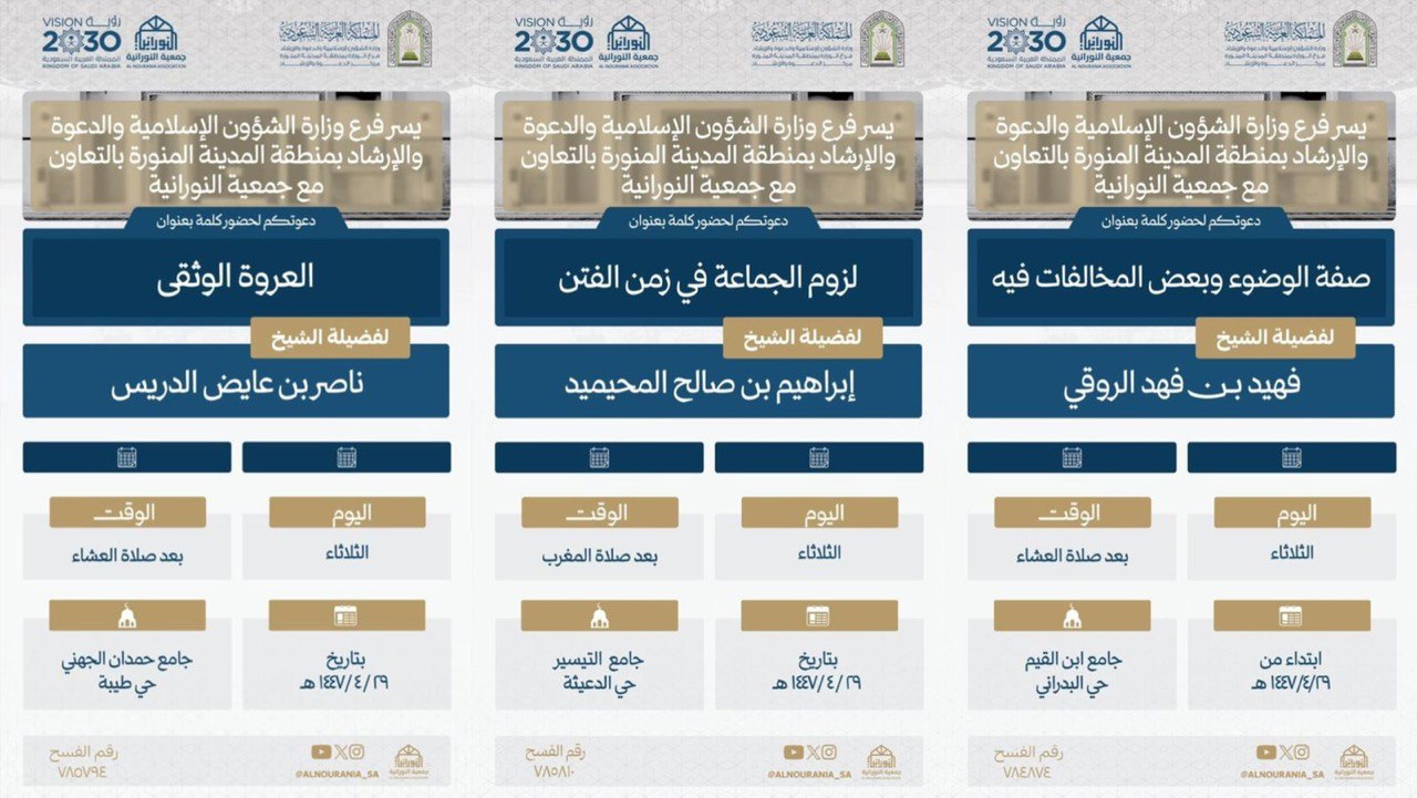 فرع الشؤون الإسلامية بالمدينة المنورة ينفذ سلسلة من الدروس العلمية بمسجد قباءينفذ فرع وزارة الشؤون الإسلامية والدعوة والإرشاد بمنطقة المدينة المنورة، ممثلاً بإدارة المساجد والدعوة والإرشاد، سلسلة من الدروس العلمية عن معاني أسماء الله الحسنى، كل يوم سبت بعد صلاة العشاء في مسجد 29/ربيع الثاني/1447 التفاصيل