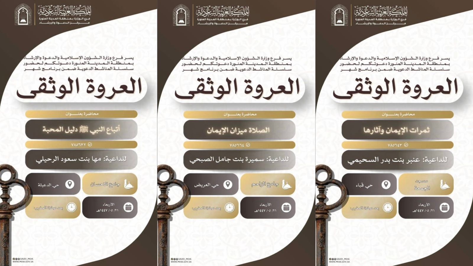 فرع الشؤون الإسلامية بالمدينة المنورة ينفذ برنامجًا دعويًا بعنوان "العروة الوثقى " بمحافظة ينبعينفذ فرع وزارة الشؤون الإسلامية بمنطقة المدينة المنورة ، مُمَثَّلاً بإدارة المساجد والدعوة والإرشاد بمحافظة ينبع، خلال الفترة من العشرون من شهر جمادى الأولى وحتى الخامس عشر من شهر جمادى الآخرة لعام ١٤٤٧هـ 21/جمادى الأولى/1447 التفاصيل