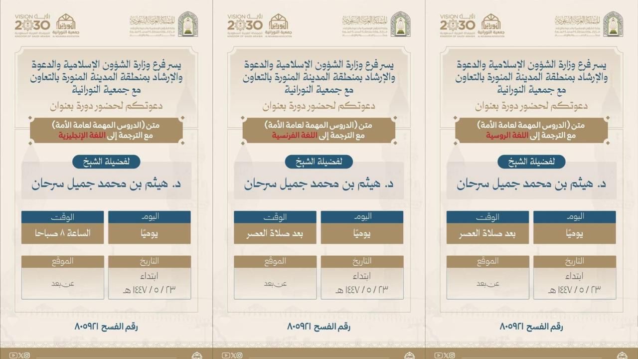 فرع "الشؤون الإسلامية" بالمدينة المنورة ينفذ دورة علمية بعدة لغاتينفذ فرع وزارة الشؤون الإسلامية والدعوة والإرشاد بمنطقة المدينة المنورة ، دورةً علمية بعنوان "متن الدروس المهمة لعامة الأمة"، وذلك ابتداءً من الثالث والعشرين من شهر جمادى الأولى لعام 1447هـ، 22/جمادى الأولى/1447 التفاصيل