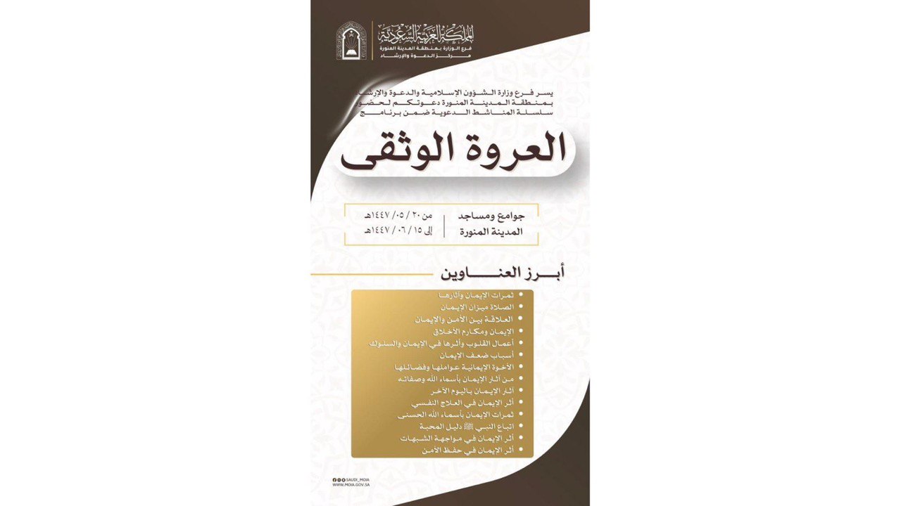 فرع الشؤون الإسلامية بالمدينة ينفذ برنامجاً دعوياً بعنوان " العروة الوثقى" بجوامع ومساجد المدينة المنورةينفذ فرع وزارة الشؤون الإسلامية والدعوة والإرشاد بمنطقة المدينة المنورة، ممثلاً بمركز الدعوة والإرشاد، خلال الفترة من العشرين من شهر جمادى الأولى وحتى الخامس عشر من شهر جمادى الآخرة لعام 1447هـ، برنامجًا 18/جمادى الأولى/1447 التفاصيل