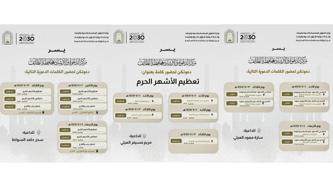 الشؤون الإسلامية بمنطقة مكة المكرمة تنظم سلسلة من الكلمات الدعوية النسائية بمحافظة رنيةتنظم وزارة الشؤون الإسلامية والدعوة والإرشاد، ممثَّلةً بفرعها في منطقة مكة المكرمة، خلال الفترة من 1 إلى 5 من شهر رجب 1447هـ، سلسلةً من الكلمات الدعوية النسائية في عددٍ من جوامع ومساجد محافظة رنية. وتناولت 02/رجب/1447 التفاصيل