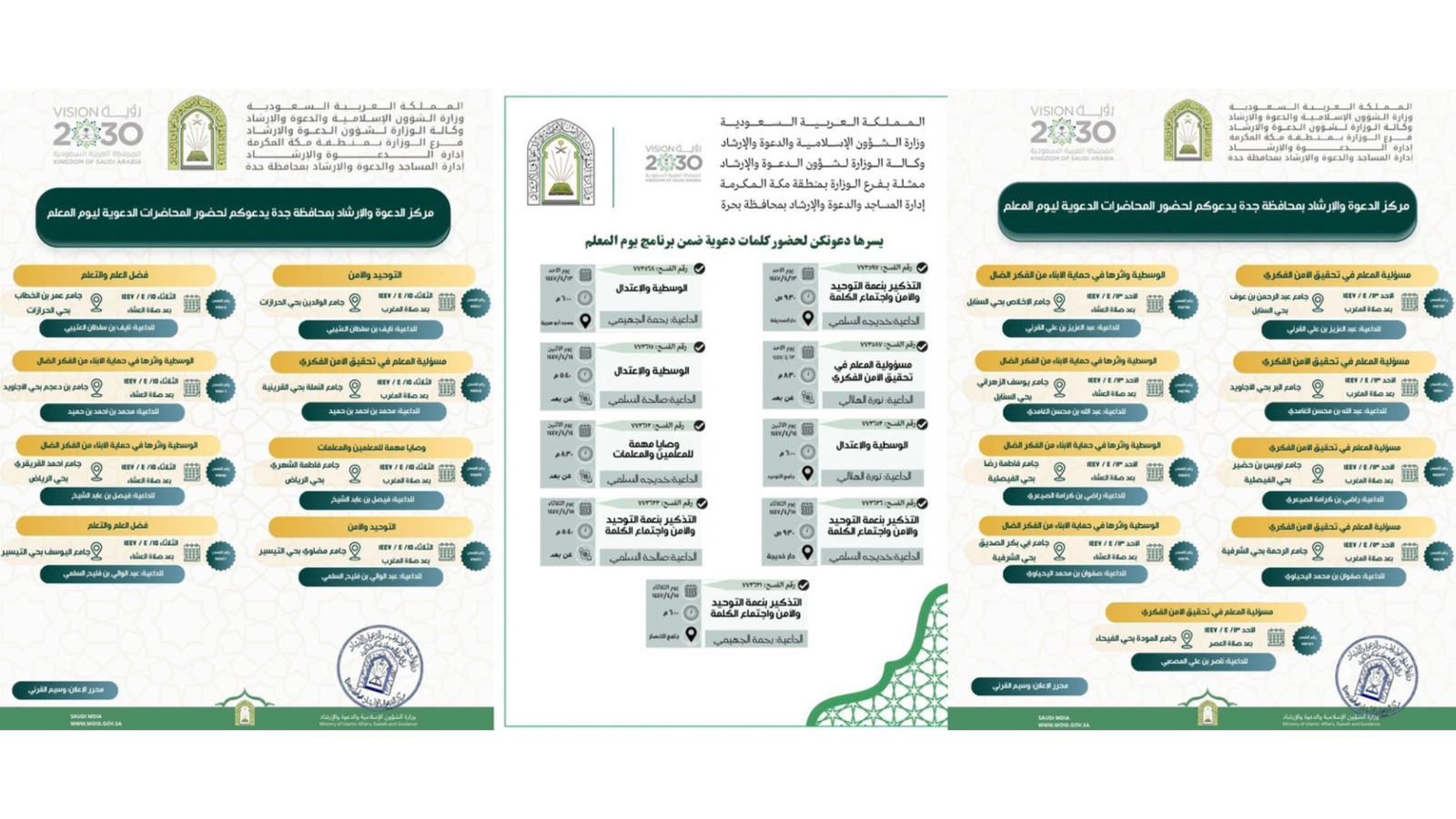 فرع الشؤون الإسلامية بمكة المكرمة ينفّذ محاضرات دعوية بمحافظتَي جدة وبحرة بمناسبة يوم المعلمنفّذ فرع وزارة الشؤون الإسلامية والدعوة والإرشاد بمنطقة مكة المكرمة، ممثلاً بمركزي الدعوة والإرشاد بمحافظتَي جدة وبحرة، مجموعة من المحاضرات الدعوية بمناسبة اليوم العالمي للمعلم، خلال الفترة من ١٣ إلى 15/ربيع الثاني/1447 التفاصيل