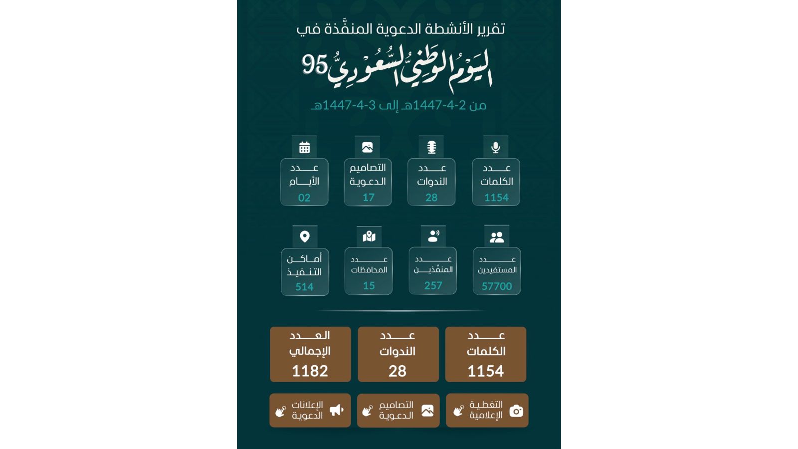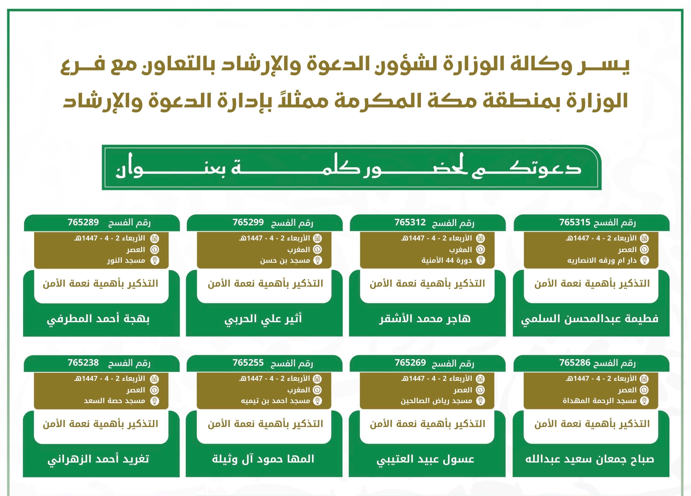 الشؤون الإسلامية بمكة المكرمة تنفذ أكثر من 1182 منشطًا دعويًا ضمن الفعاليات المصاحبة لليوم الوطني السعودينفذت وزارة الشؤون الإسلامية والدعوة والإرشاد، ممثلة بفرعها في منطقة مكة المكرمة، خلال الفترة من الثاني وحتى الثالث من شهر ربيع الآخر 1447هـ، أكثر من (1128) منشطًا دعويًا، وذلك ضمن الفعاليات المصاحبة لليوم 06/ربيع الثاني/1447 التفاصيل