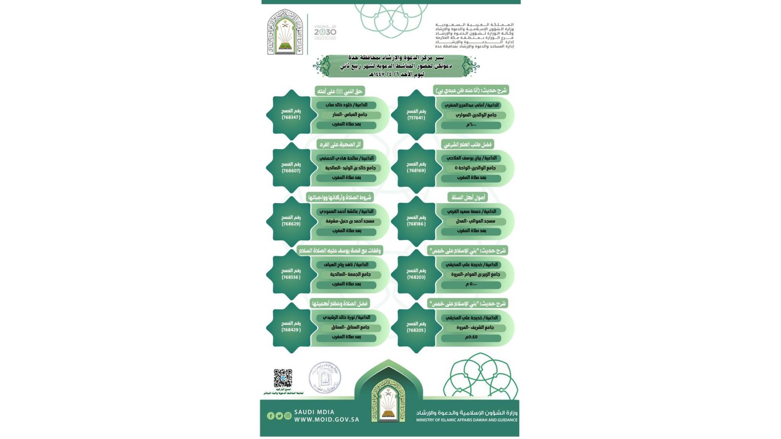 فرع الشؤون الإسلامية بمكة المكرمة ينظم سلسلة من المناشط الدعوية بمحافظة جدةينظم فرع وزارة الشؤون الإسلامية والدعوة والإرشاد بمنطقة مكة المكرمة، ممثلاً بمركز الدعوة والإرشاد بمحافظة جدة، سلسلة من المناشط الدعوية خلال الفترة من 6 إلى 12 ربيع الآخر 1447هـ، وذلك في عدد من الجوامع 06/ربيع الثاني/1447 التفاصيل