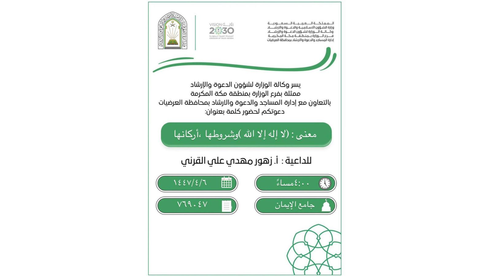 الشؤون الإسلامية بمكة المكرمة تنظم كلمات وعظيه بجوامع ومساجد محافظة العرضياتينظم فرع وزارة الشؤون الإسلامية والدعوة والإرشاد بمنطقة مكة المكرمة، ممثلاً بإدارة المساجد والدعوة والإرشاد بمحافظة العرضيات، سلسلة من الكلمات والمناشط الدعوية خلال الفترة من 6 إلى 10 ربيع الثاني لعام 06/ربيع الثاني/1447 التفاصيل