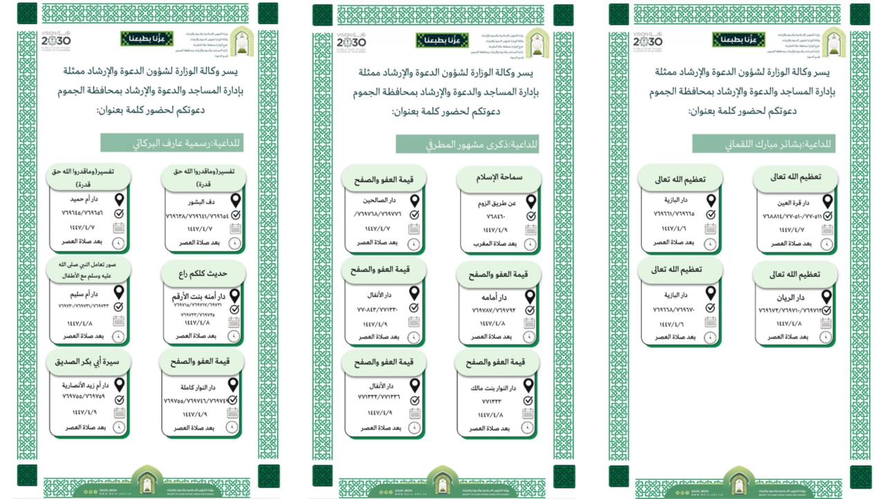 الشؤون الإسلامية تنفذ سلسلة من المناشط الدعوية بمحافظة الجمومينفذ فرع وزارة الشؤون الإسلامية والدعوة والإرشاد بمنطقة مكة المكرمة، بالتعاون مع إدارة المساجد والدعوة والإرشاد بمحافظة الجموم، سلسلة من المحاضرات والدروس الدعوية في عدد من الجوامع والمساجد، إضافة إلى 07/ربيع الثاني/1447 التفاصيل