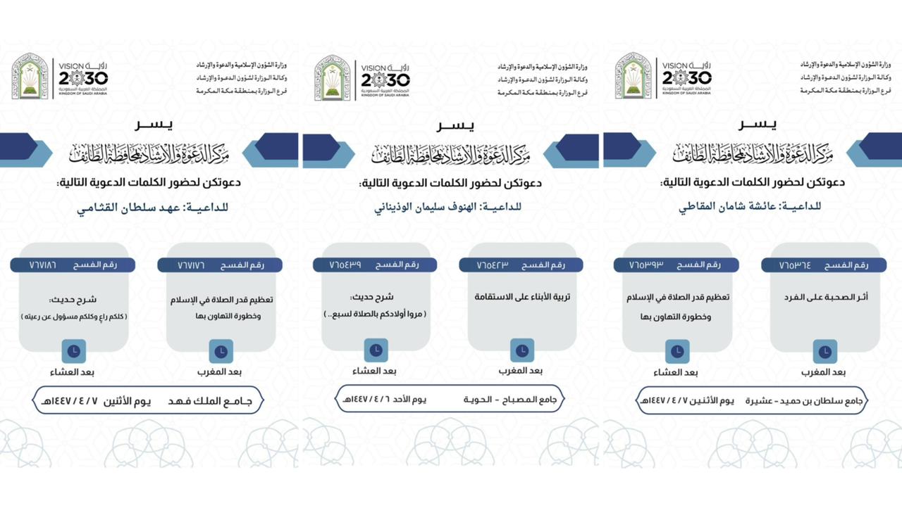 الشؤون الإسلامية تنظم سلسلة من الكلمات الدعوية النسائية بجوامع ومساجد محافظة الطايفينظم فرع وزارة الشؤون الإسلامية والدعوة والإرشاد بمنطقة مكة المكرمة، ممثلاً بإدارة المساجد والدعوة والإرشاد بمحافظة الطائف، خلال الفترة من السادس وحتى التاسع من شهر ربيع الآخر 1447هـ، سلسلة من الكلمات 07/ربيع الثاني/1447 التفاصيل