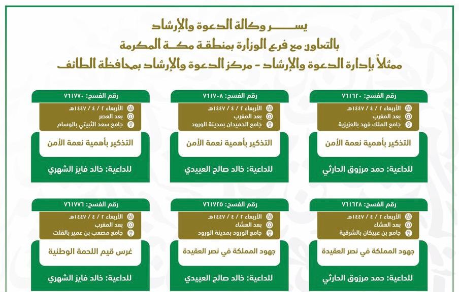 • الشؤون الإسلامية والدعوة والإرشاد بمنطقة مكة المكرمة تنظم سلسلة من المحاضرات الدعوية تزامنًا مع اليوم الوطني بمحافظة الطائف ،