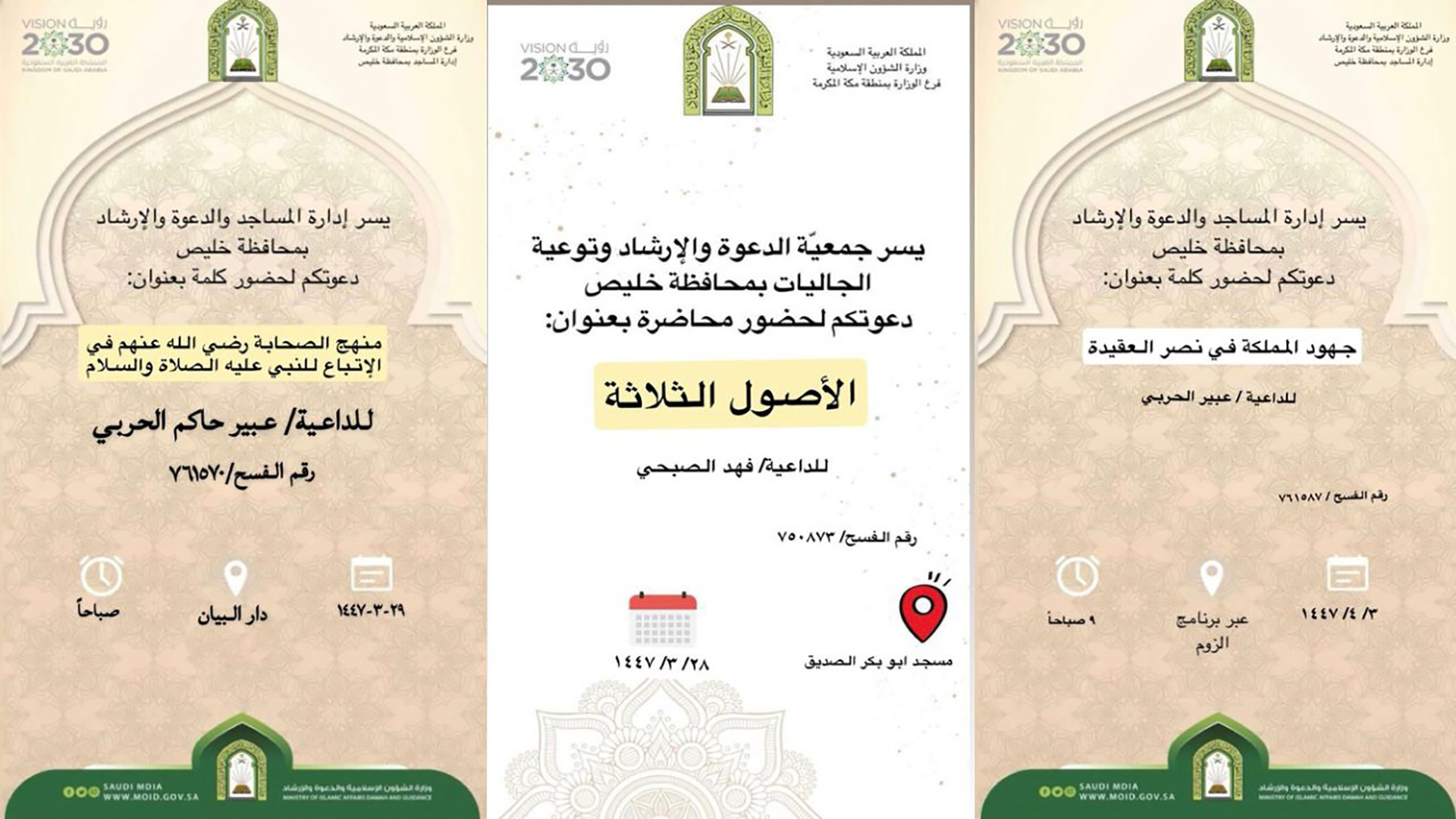 ينفذ فرع وزارة الشؤون الإسلامية والدعوة والإرشاد بمنطقة مكة المكرمة، ممثلاً بإدارة المساجد والدعوة والإرشاد بمحافظة خليص، خلال الفترة من الثامن والعشرين من شهر ربيع الأول وحتى الثاني من شهر ربيع الآخر