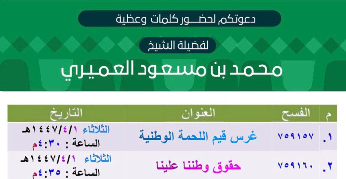 ​نظم فرع وزارة الشؤون الإسلامية والدعوة والإرشاد بمنطقة مكة المكرمة، ممثلاً بإدارة المساجد والدعوة والإرشاد بمحافظة القنفذة، كلمات دعوية بمناسبة اليوم الوطني الـ95 للمملكة، خلال الفترة من ٢ الى ٤ ربيع