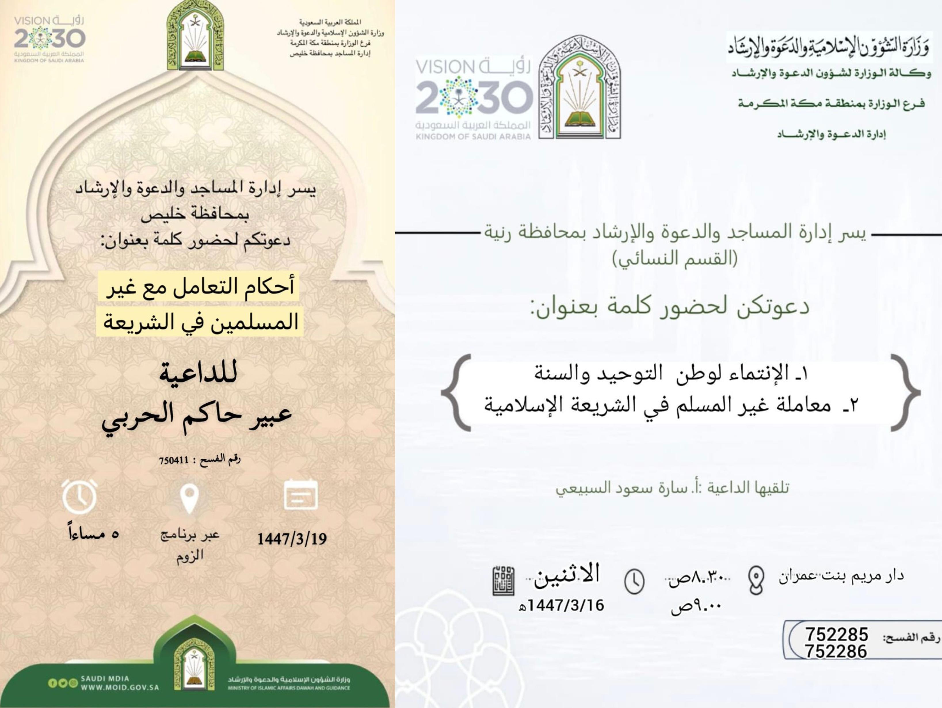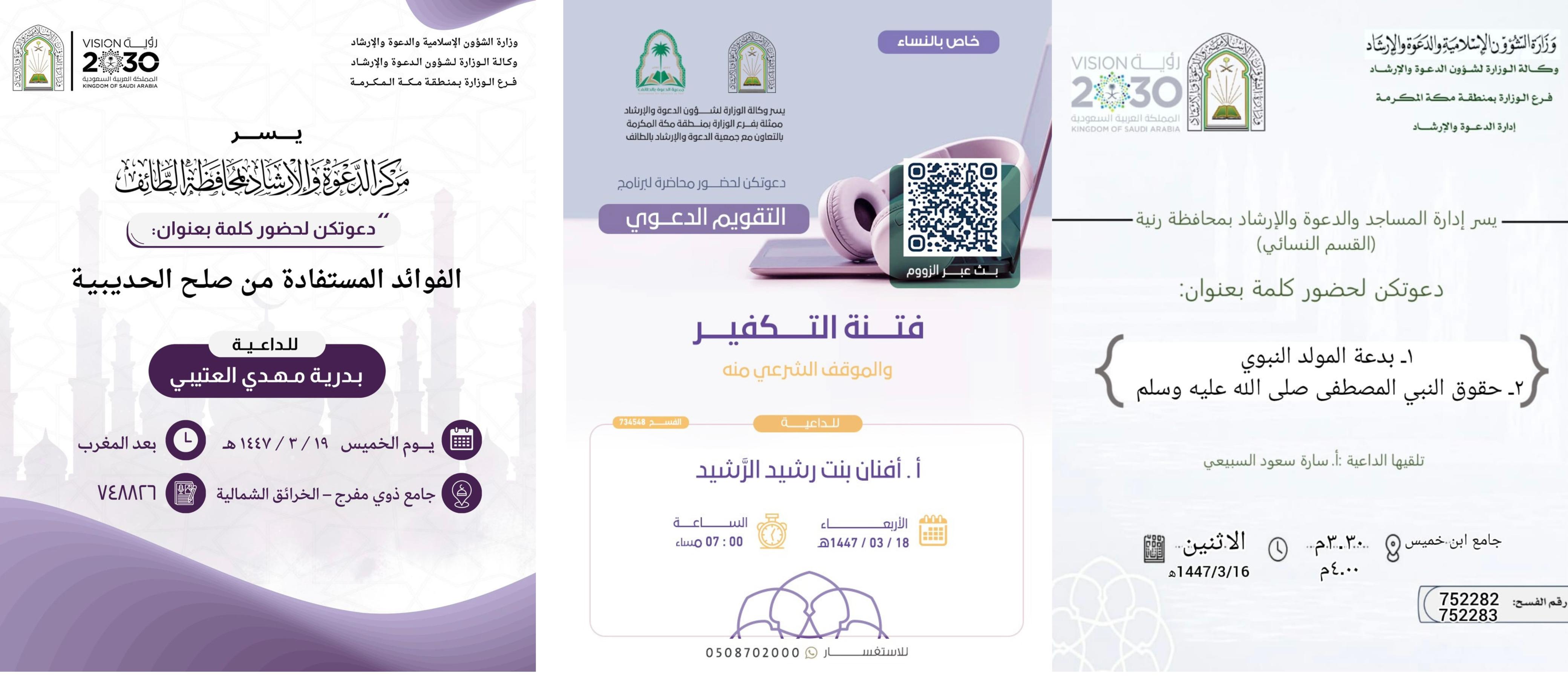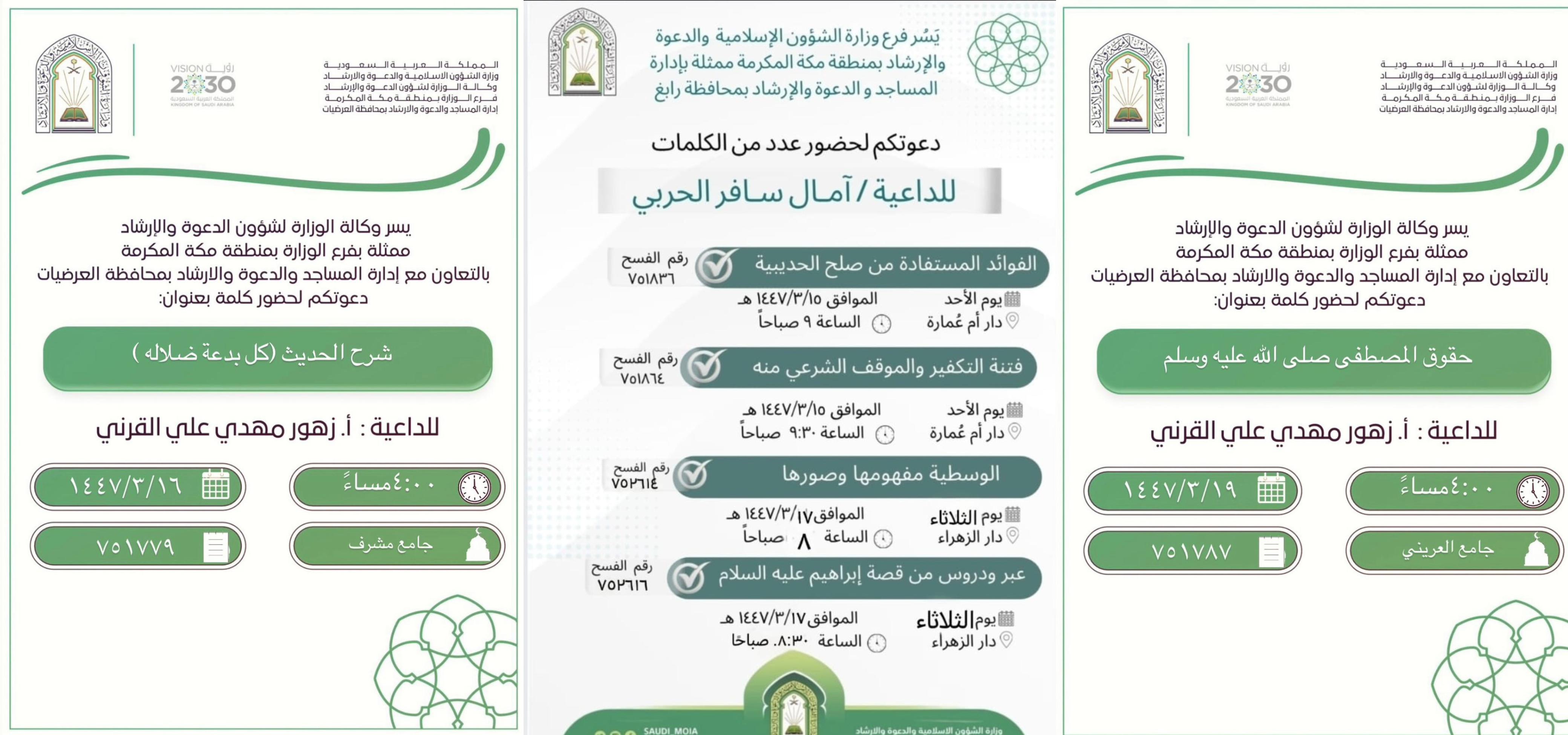 “الشؤون الإسلامية بمكة المكرمة ” تُنفذ عدد من المناشط النسائية في مختلف محافظات المنطقة .يُنفذ فرع وزارة الشؤون الإسلامية والدعوة والإرشاد بمنطقة مكة المكرمة سلسلة من الكلمات الدعوية والدروس العلمية والمحاضرات النسائية ، وذلك خلال الفترة الممتدة من 15 إلى 19 من شهر ربيع الأول الجاري لعام 18/ربيع الأول/1447 التفاصيل