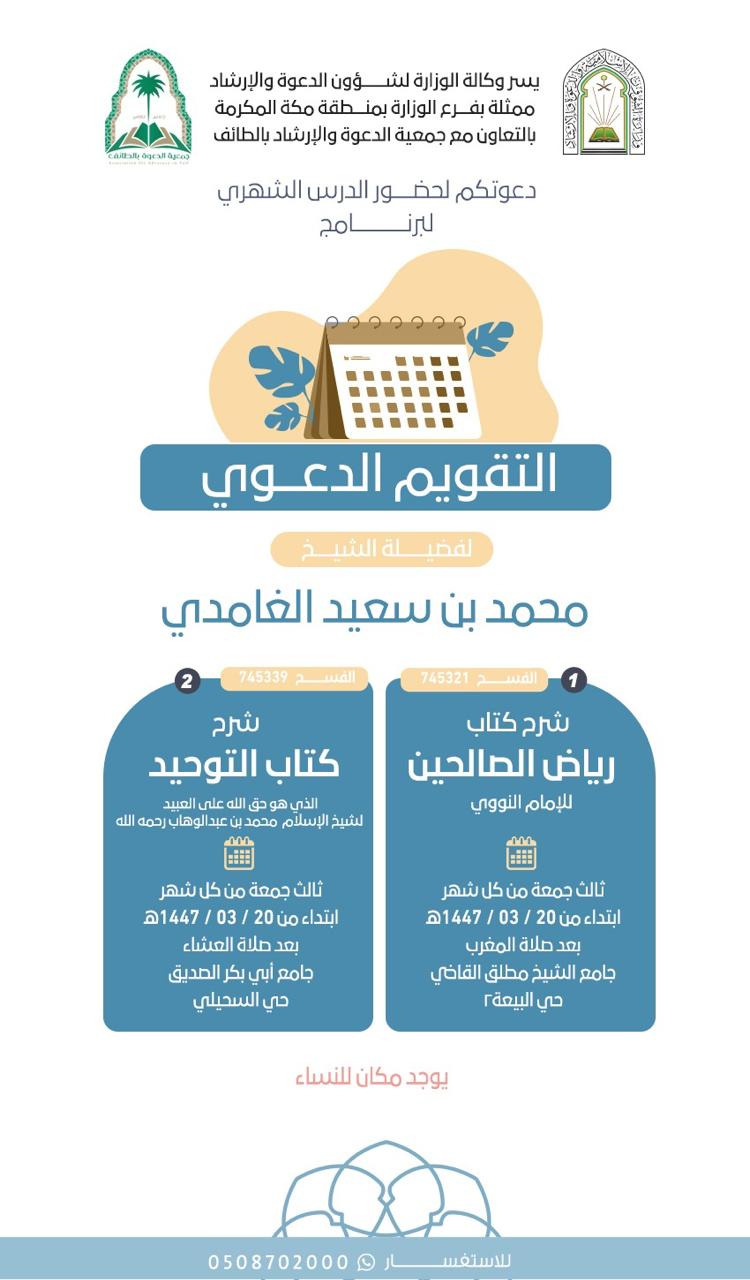 الشؤون الإسلامية بمكة تنظم الدرس الشهري ضمن برنامج التقويم الدعوي بالطائفينظم فرع وزارة الشؤون الإسلامية والدعوة والإرشاد بمنطقة مكة المكرمة، بالتعاون مع جمعية الدعوة والإرشاد بالطائف، الدرس الشهري ضمن برنامج التقويم الدعوي. ويشتمل البرنامج على درسين ثابتين يقامان ثالث 18/ربيع الأول/1447 التفاصيل