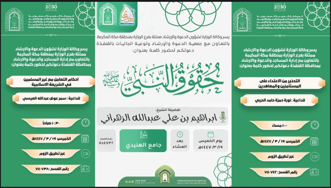 الشؤون الإسلامية بمكة المكرمة تنفذ مناشط دعوية بمحافظتي رنية وخليصينفذ فرع وزارة الشؤون الإسلامية والدعوة والإرشاد بمنطقة مكة المكرمة، بالتعاون مع إدارات المساجد والدعوة والإرشاد بمحافظتي رنية وخليص، سلسلة من المناشط الدعوية في الجوامع ومساجد ودور التحفيظ، إلى جانب 17/ربيع الأول/1447 التفاصيل