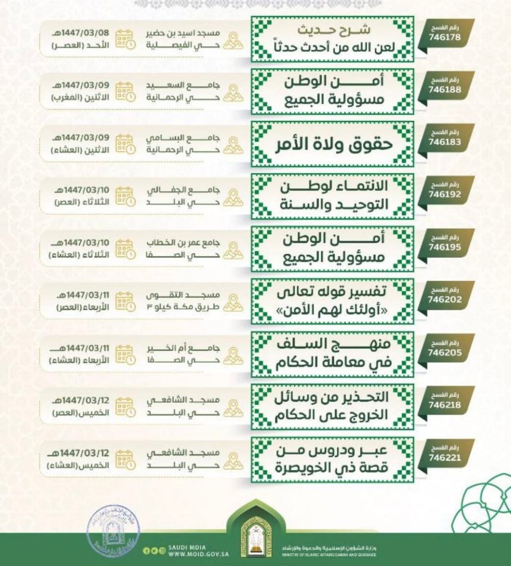 الشؤون الإسلامية بمكة المكرمة” تُنفذ عددًا من المناشط الدعوية في الجهات الحكوميةيُنفذ فرع وزارة الشؤون الإسلامية والدعوة والإرشاد بمنطقة مكة المكرمة، بالتعاون مع عدد من الجهات الحكومية، سلسلة من الكلمات الدعوية والدروس العلمية، وذلك خلال الفترة من 15 إلى 19 من شهر ربيع الأول الجاري 16/ربيع الأول/1447 التفاصيل